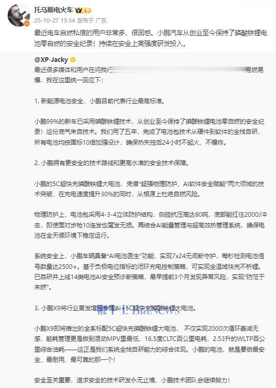 今日,小鹏汽车动力总成高级总监发文回应小鹏汽车电池安全性问题。