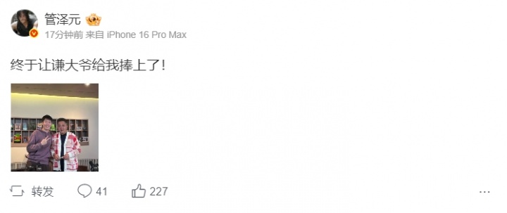 人捧人高!管泽元晒与于谦合影:终于让谦大爷给我捧上了!
