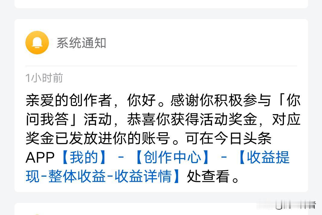 大家今天都收到你问我答的活动奖励了吗? 今天收到你问我答活动的奖励,足足有156元,这是我参加活动以来收入最高的一次。以前最多就瓜分几十块钱。也不知道这个活动奖励是怎么分配的,就记得自己发了十几篇关于你问我答的微头条,好像有几篇的展现量和阅读量都很高。今天收到的156元不知道和这个有没有关系。 其实有时候参加头条活动广场的征文收入还是不错的。不过要选择自己擅长的领域来写。毕竟自己喜欢的话题才好提笔。