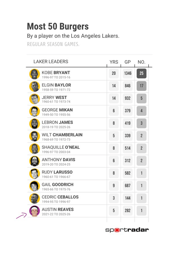 根据数据统计,里夫斯是湖人队史第12位50+先生,科比25次50+位居湖人队史榜首,詹姆斯3次位居第5。