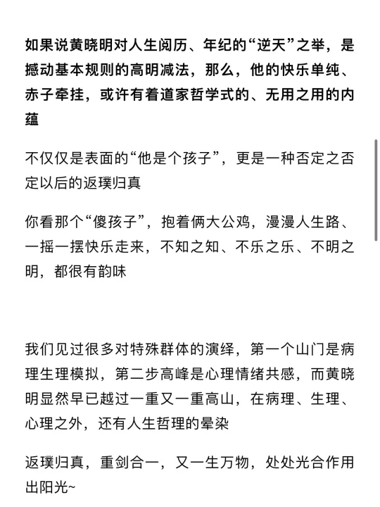 黄晓明的呈现,当然也不仅仅是“智力停留在小孩子水平”,更是一种疗愈的赤子状态,一种无何有之乡的天真自足状态