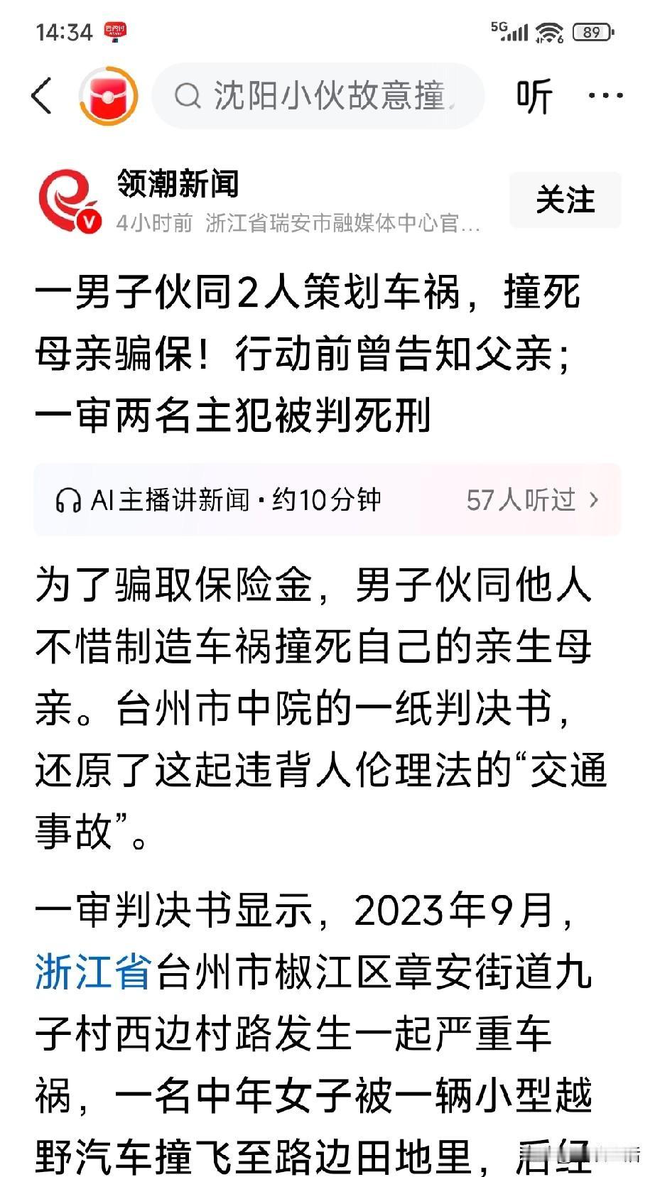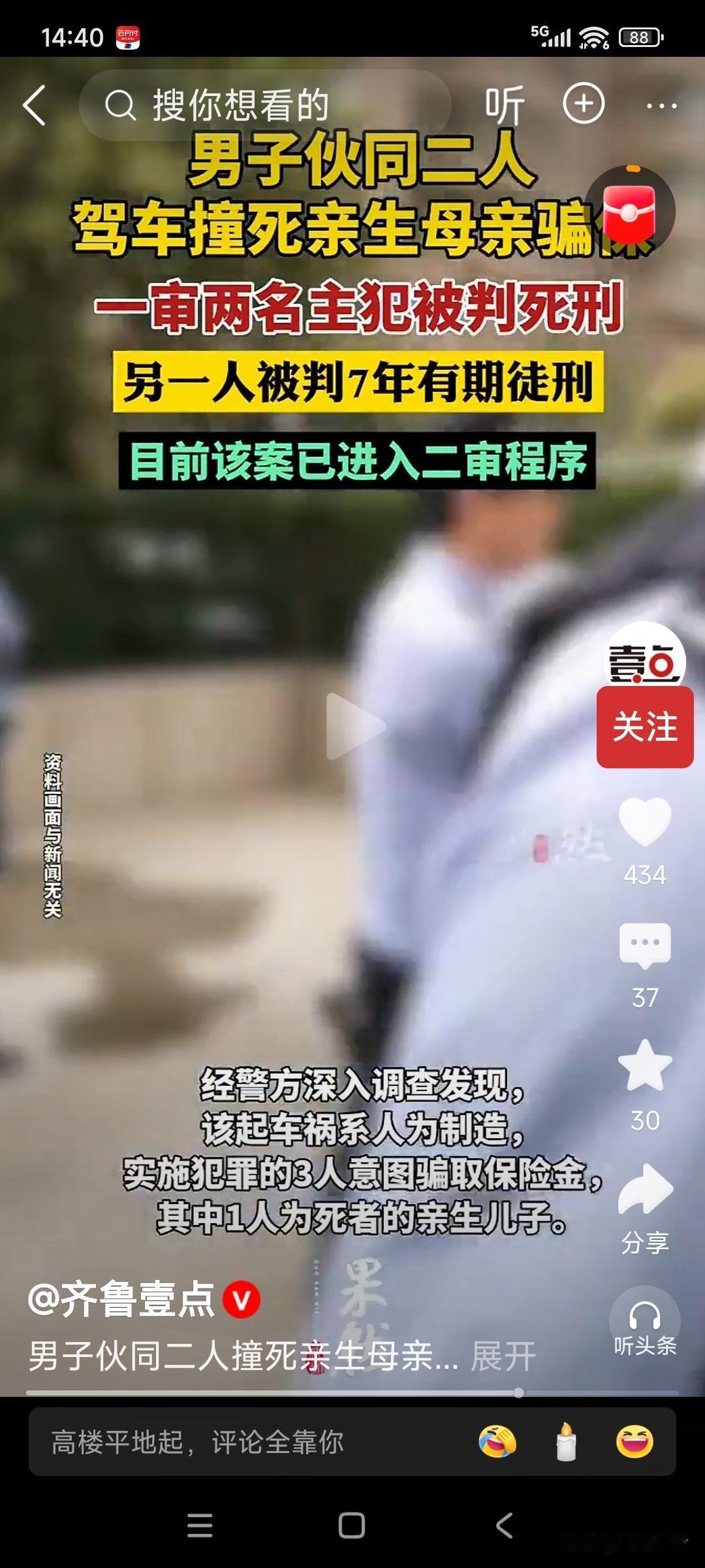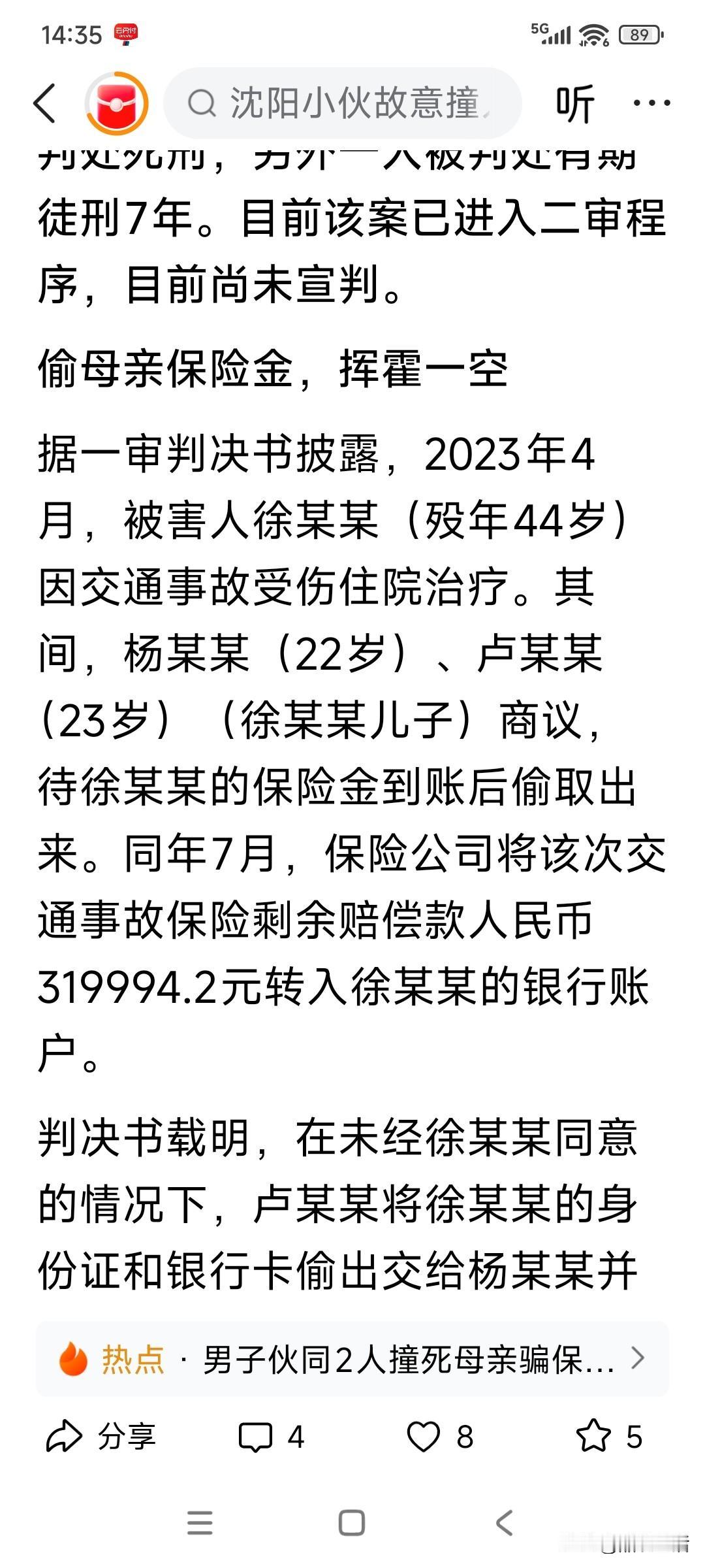 可悲啊!家里3套房,被卢某挥霍了,母亲交通事故31万赔偿,也花了,甚至2次刺伤母亲和父亲的眼睛,想骗取保险金,未遂, 这些卢某的父亲事先都知道,甚至默许儿子刺伤自己? 这是怎样冷漠的父子? 直到悲剧发生, 尝到了31万保险金,的甜头! 卢某竟然伙同其他2人,撞死了亲生的母亲! 他主动把母亲骗到出事地,自己站在一边,眼睁睁看着同伙,撞飞她,还装模作样,把母亲送到医院救治! 可怜母亲,才44岁,到死都不知道是,亲生儿子,几次三番,伤害她! 更可悲的是, 出事前两天,卢某3人把计划告诉了父亲,起初他还不同意,直到儿子苦苦哀求,需要钱,他才愤然说,随便你们吧? 这个父亲不报/警,任着儿子胡作非为,撞死亲生母亲,这还不如养条狗啊! 惯子如杀子! 真的是,报/应不爽! 这下好了!母亲被撞死,儿子被判死,父亲可曾后悔过?