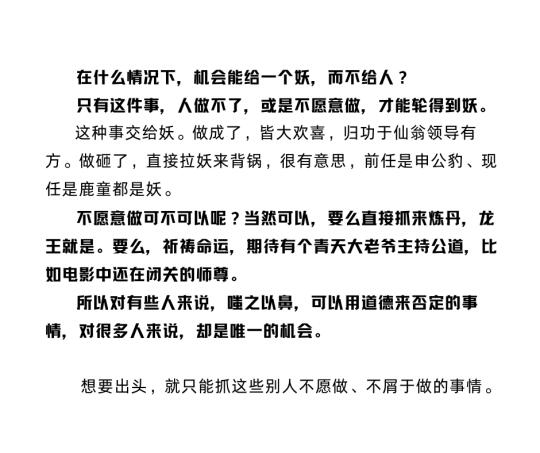 在什么情况下,机会能给一个妖而不给人?只有这件事,人做不了,或是不愿意做,才能轮得到妖。所以对有些人来说,嗤之以鼻,可以用道德来否定的事情,对很多人来说,却是唯一的机会。想要出头,就只能抓这些别人不愿做、不屑于做的事情。