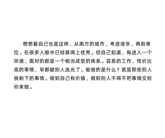 想想看自己也是这样,从南方的城市,考进清华,再到单位。在很多人眼中已经算得上优秀。但自己知道,每进入一个环境,面对的都是一个相当成型的体系。容易的工作、性价比高的事情,早都被别人选光了。能做的是什么?就是那些别人挑剩下的事情。