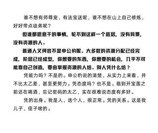 普通人又何尝不是申公豹呢。大多数的资源分配已经完成,阶层已经成型,你想要的东西,你想要的机会,不太可能靠自己创造,要由掌握资源的人给。别人凭什么给?凭能力吗?不是的。申公豹说的清楚,从实力上来看,并不比太乙差,甚至更努力。凭态度吗?也不是。临到开宝莲之前还在喝酒,忘记密码的太乙,实在很难说态度有多好。凭的是什么?凭出身。我是人,选个人,很正常。凭关系。这是我儿子,侄子啥的。