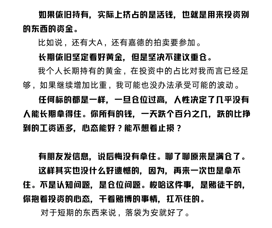 长期依旧坚定看好黄金,但是坚决不建议重仓。