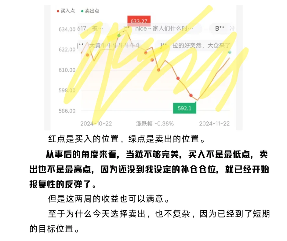 在两周前大跌开始时,谈到下跌就是机会。我自己也是每隔一个位置就买入。简单来说跌的越多,买的越多。贴一张我自己的操作图。从事后的角度来看,当然不够完美,最低的低点没有买入,因为还没有到我设定的补仓仓位,就已经开始报复性的反弹了。