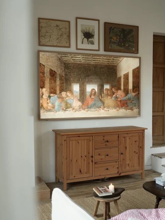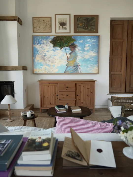 🎨搭配浅胡桃木色画框,它的旗舰美学和旗舰画质,真实还原了画作,我的是85寸,真像是把巨幅画作挂在客厅里,而且可以随时更换壁纸,就像购买了一幅可变的艺术画作。