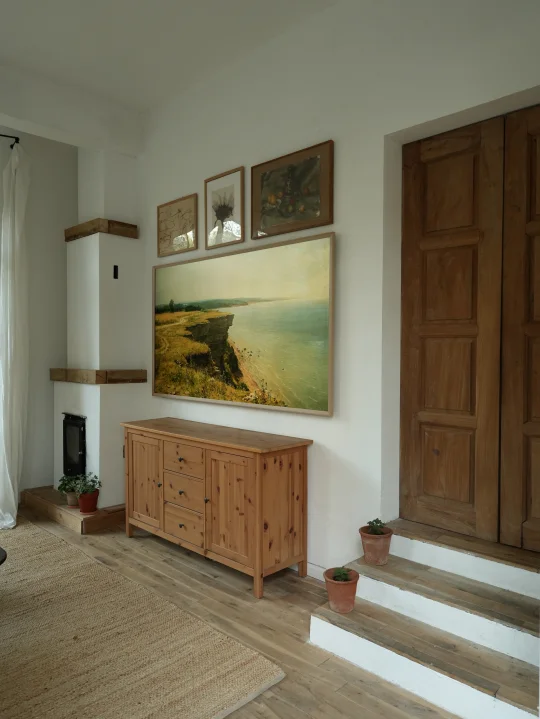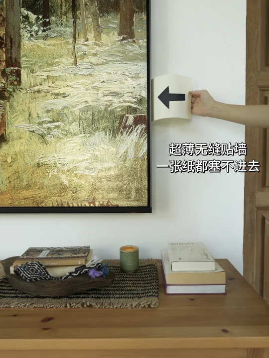 🏠之所以把壁炉建在侧边,保留了一面白墙,是为了布置一个画墙,无奈又有看电视的需求,这个想法就一直被耽搁,普通大电视挂在墙上真的很难和画以及家居环境融为一体,所以在之前拍摄时一直避开这个地方。