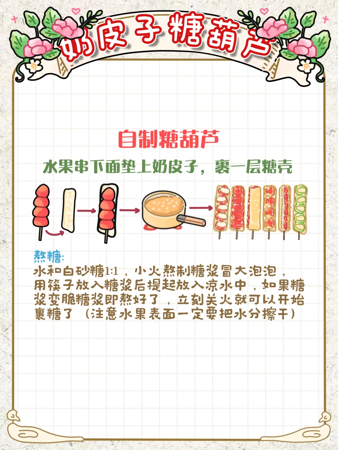 自己喜欢的水果🍓(一定要擦干水分💧),下方贴上奶皮子之后裹上糖壳