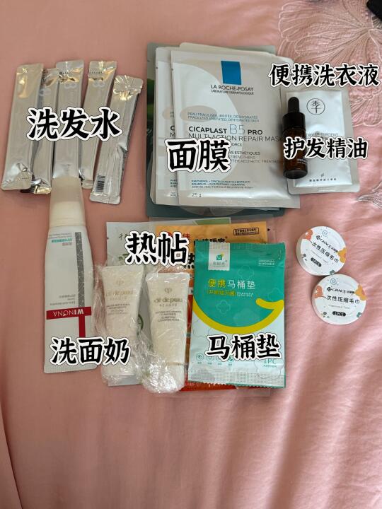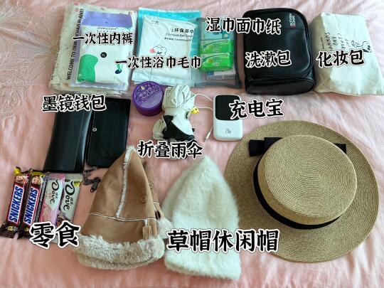 旅行背包、随身小包、雨伞或雨衣、纸巾、湿巾、水杯、零食、口罩、塑料袋(装脏衣物或垃圾)