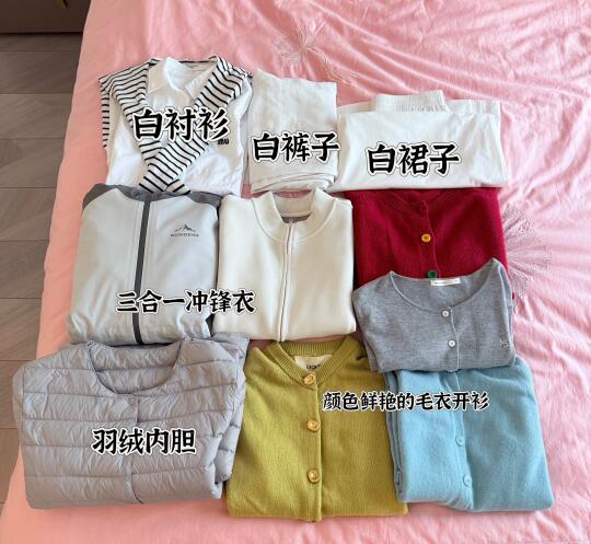 三合一冲锋衣、羽绒内胆、多巴胺毛衣开衫、白裤子、白裙子(搭各种颜色上衣👍)