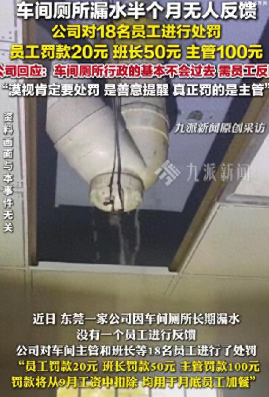 近日,东莞一家公司因车间厕所长期漏水,没有一个员工进行反馈,公司对包括车间主管和班长等员工进行了处罚,引起关注。
