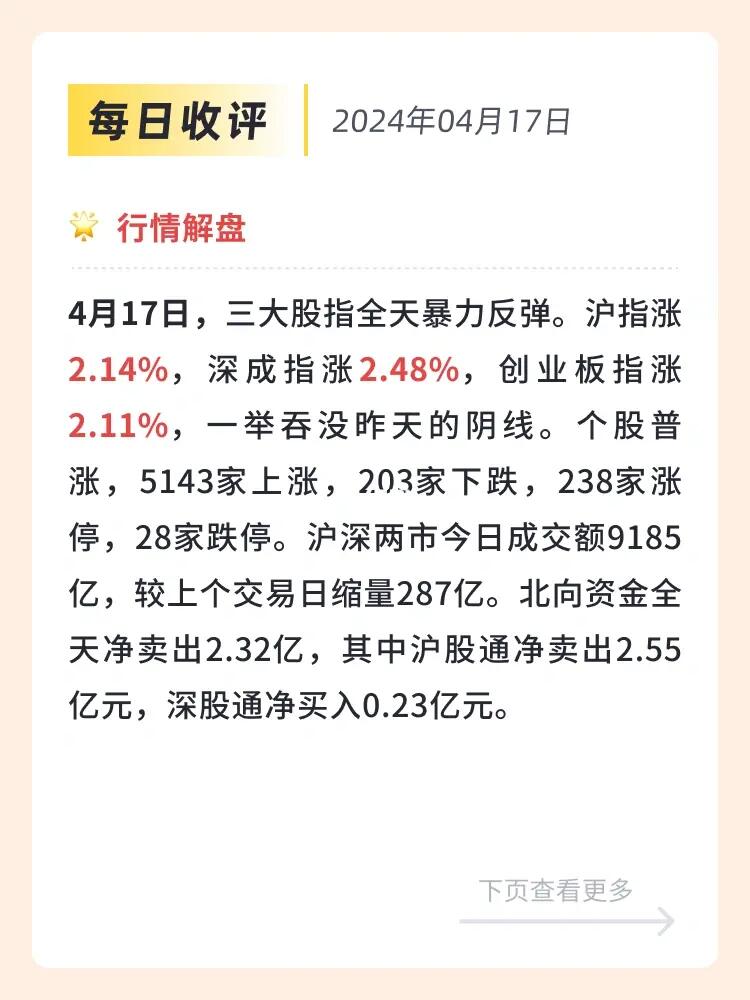 👉 4月17日,三大股指全天暴力反弹。沪指涨2.14%,深成指涨2.48%,创业板指涨2.11%,一举吞没昨天的阴线。个股普涨,5143家上涨,203家下跌,238家涨停,28家跌停。沪深两市今日成交额9185亿,较上个交易日缩量287亿。北向资金全天净卖出2.32亿,其中沪股通净卖出2.55亿元,深股通净买入0.23亿元。