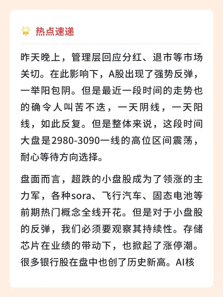 👉 盘面而言,超跌的小盘股成为了领涨的主力军,各种sora、飞行汽车、固态电池等前期热门概念全线开花。但是对于小盘股的反弹,我们必须要观察其持续性。存储芯片在业绩的带动下,也掀起了涨停潮。很多银行股在盘中也创了历史新高。AI核心表现的也不错。唯一下跌的只有ST板块。