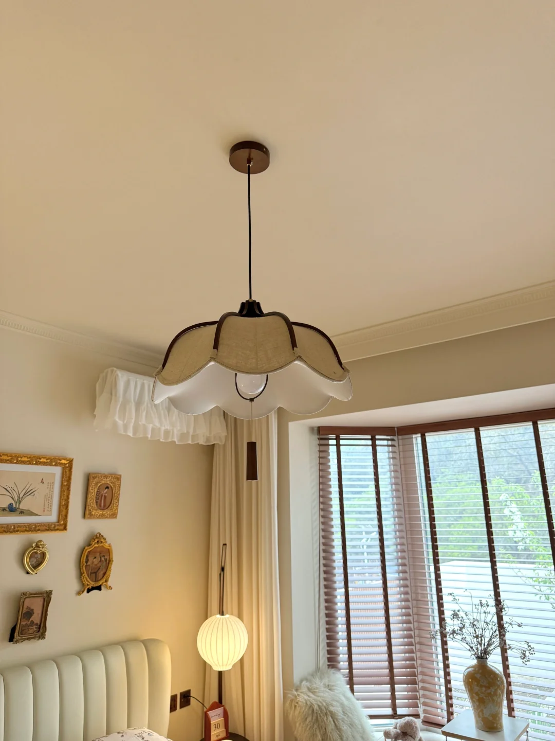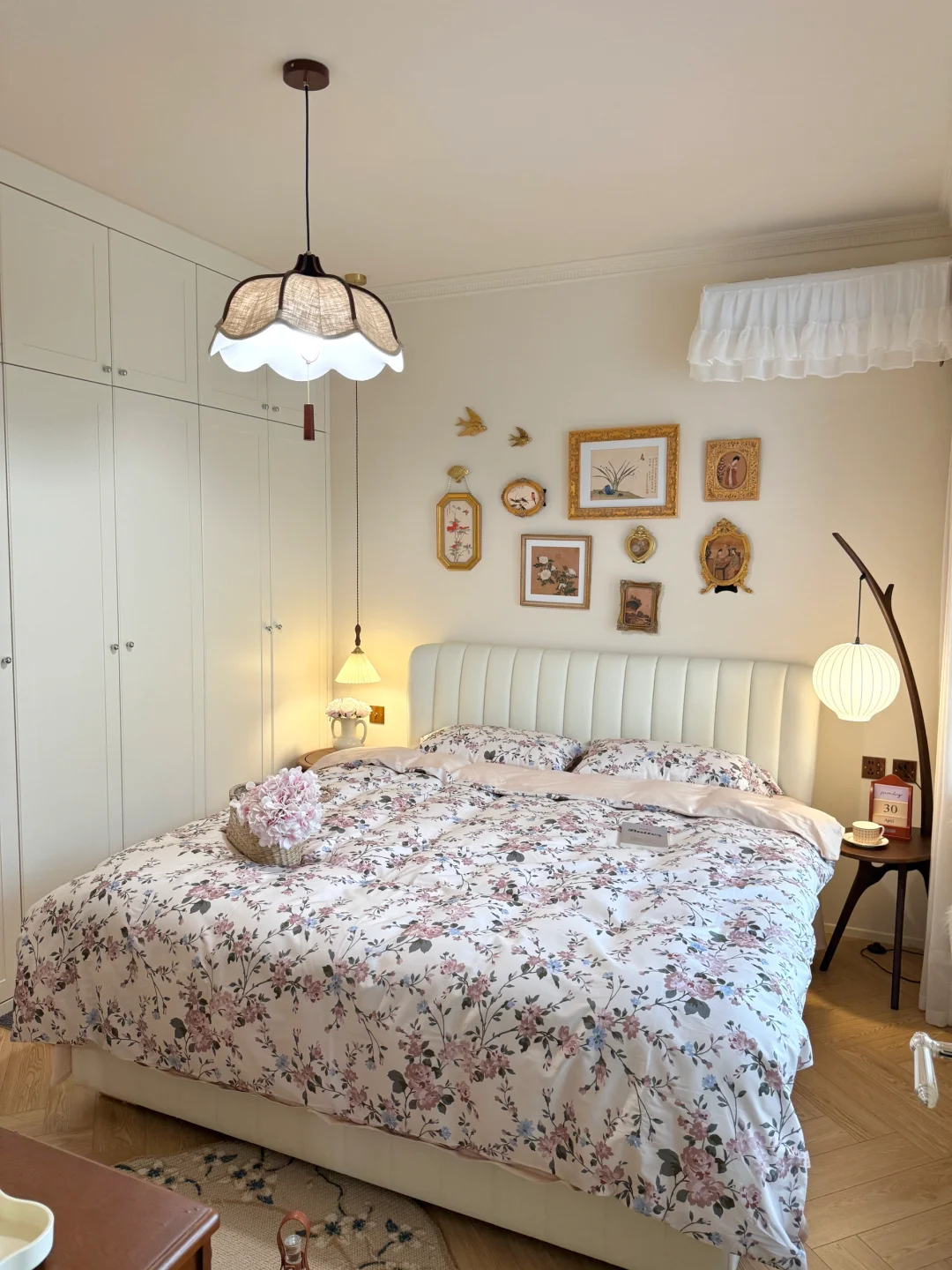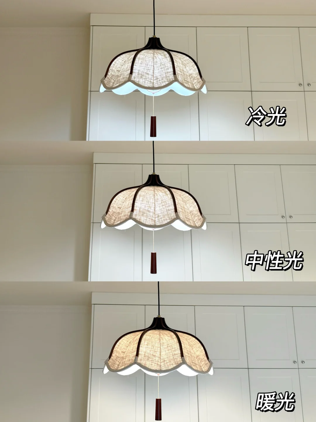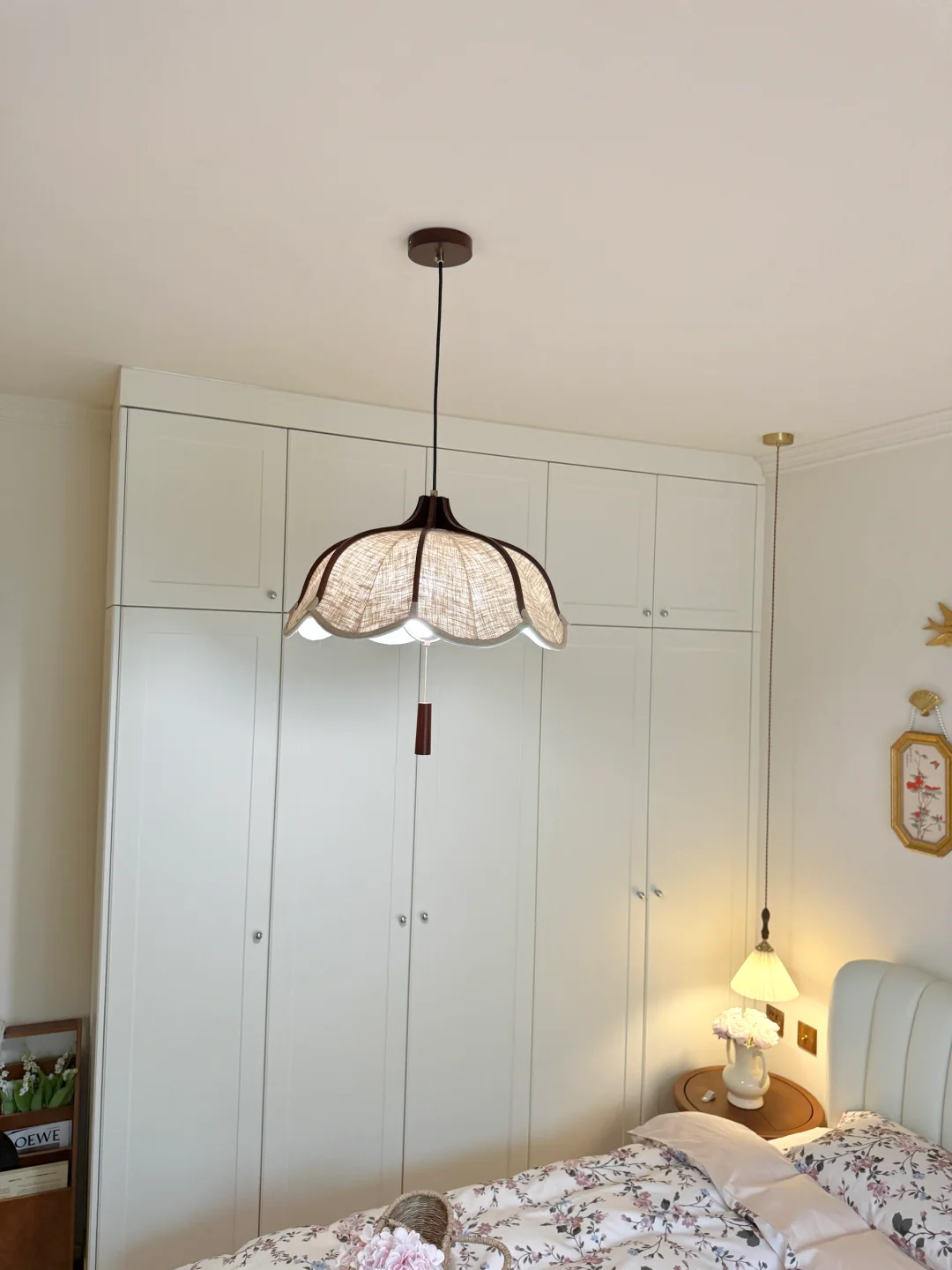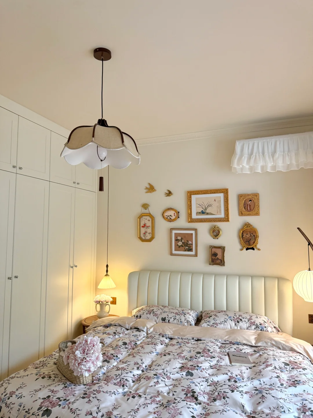 hello大家欢迎参观我的中古风卧室 卧室空间不大却兼具美观与实用 遵循了轻硬装重软装的原则 奶油色乳胶漆通刷搭配钢琴键石膏线 木百叶和亚麻纱的搭配复古又温柔 . 给房间换了一盏适配度更高的灯 来自casagd照明家的花影吊灯 中古风配色再加上温柔的花瓣设计 木质的灯体搭配布艺灯罩 简约又不失高级感 就像一件美好的艺术品一样 可以三色变光,灯光柔和不刺眼 50cm的直径放在12平的房间里刚刚好 能很好的照亮房间,大小与其它家具也很搭 . 不得不说选好一盏灯 是一间温馨卧室的点睛之笔~