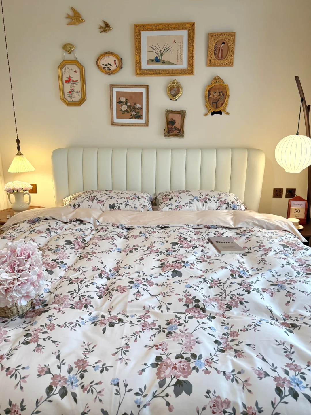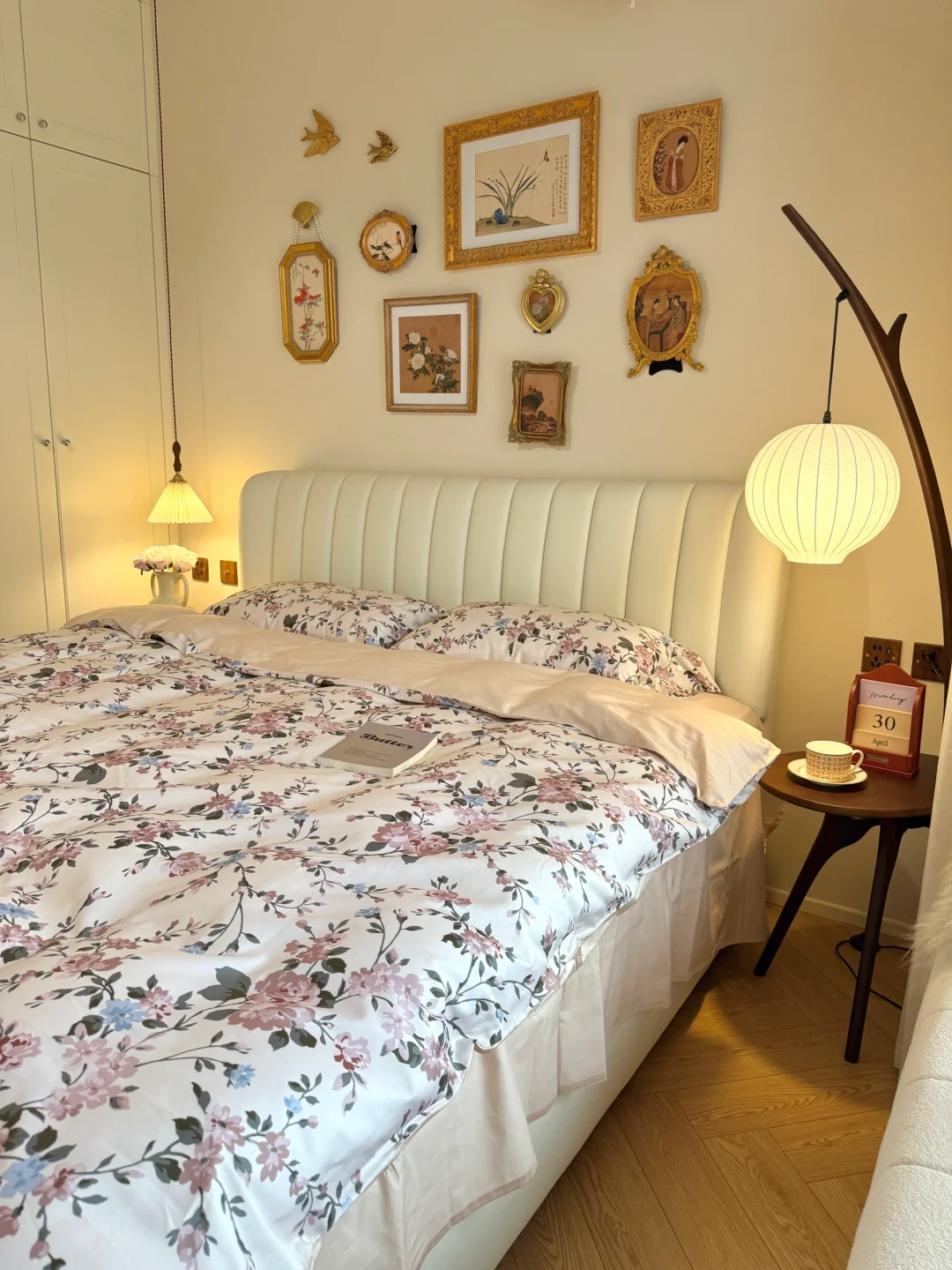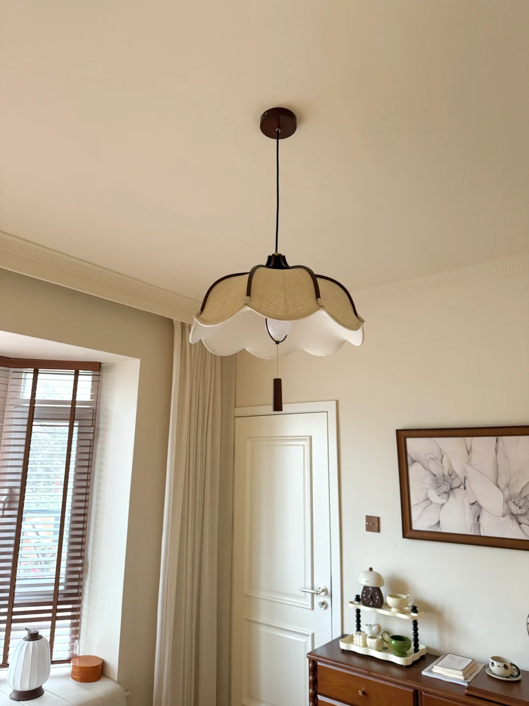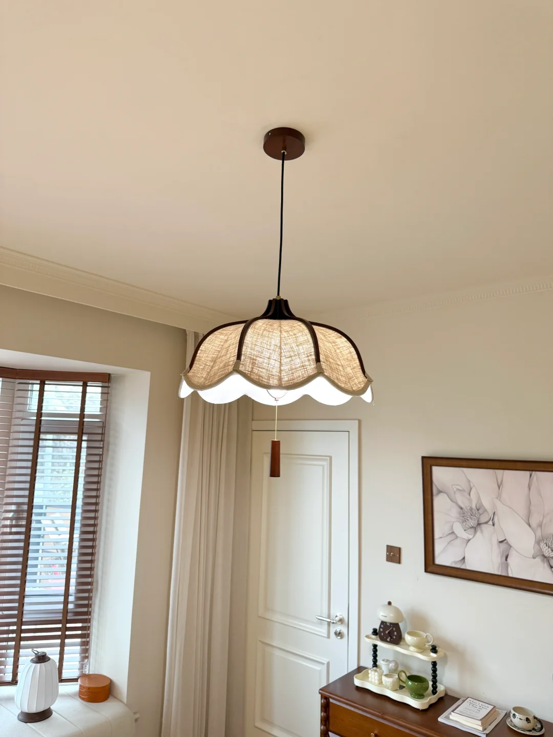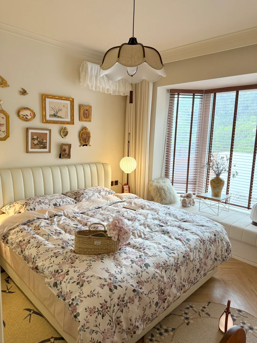 hello大家欢迎参观我的中古风卧室 卧室空间不大却兼具美观与实用 遵循了轻硬装重软装的原则 奶油色乳胶漆通刷搭配钢琴键石膏线 木百叶和亚麻纱的搭配复古又温柔 . 给房间换了一盏适配度更高的灯 来自casagd照明家的花影吊灯 中古风配色再加上温柔的花瓣设计 木质的灯体搭配布艺灯罩 简约又不失高级感 就像一件美好的艺术品一样 可以三色变光,灯光柔和不刺眼 50cm的直径放在12平的房间里刚刚好 能很好的照亮房间,大小与其它家具也很搭 . 不得不说选好一盏灯 是一间温馨卧室的点睛之笔~