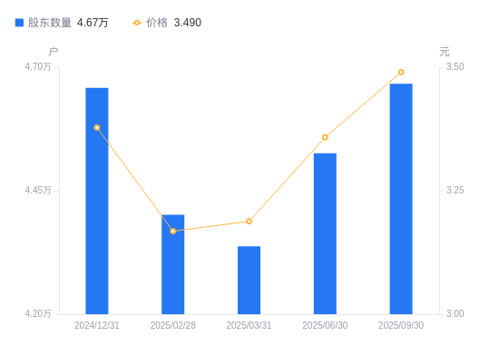 近一年(2024年9月30日至2025年9月30日),胜利股份A股股东户数从4.53万户,增加至4.67万户,增幅3.11%,区间股价上涨19.60%。
