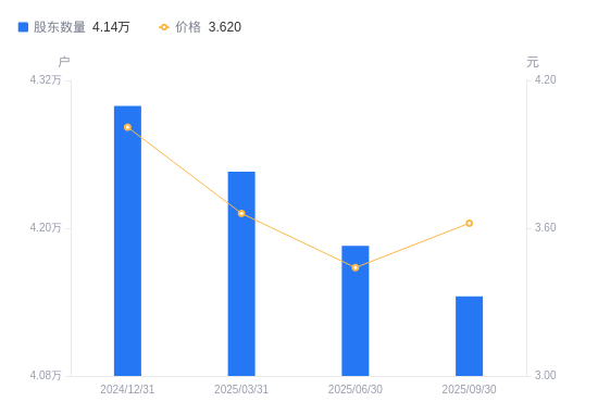 日期A股户数(户)流通A股户均持股数(股)户均持股市值(万元)2025-09-304144645081.7916.322025-06-304185744639.1315.362025-03-314245844007.2516.112024-12-314299343459.6317.432024-09-304673339981.6017.512024-06-304483041678.7915.302024-03-314618240458.6216.952023-12-314372242735.0118.162023-09-303690250633.0328.912023-06-304791238997.7417.04