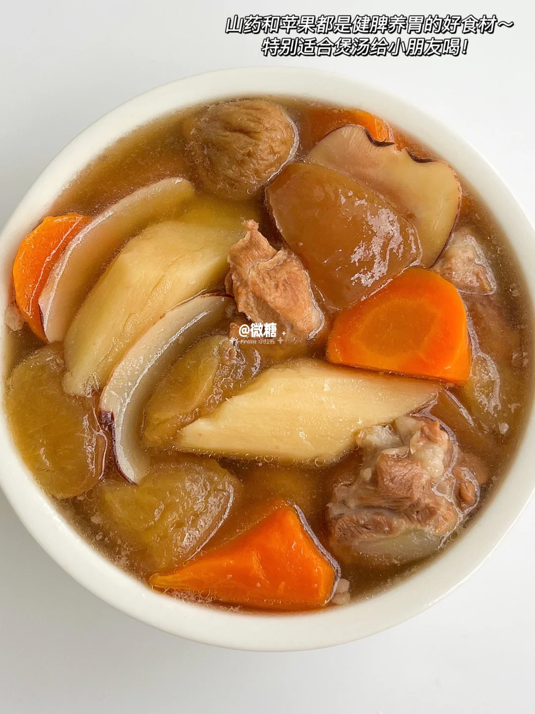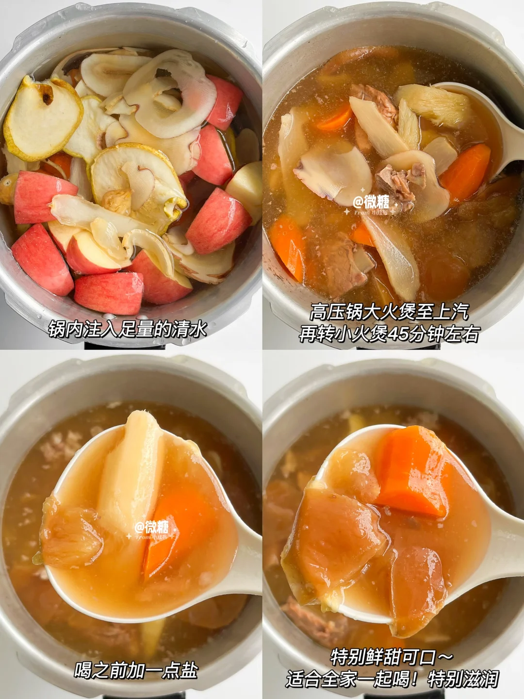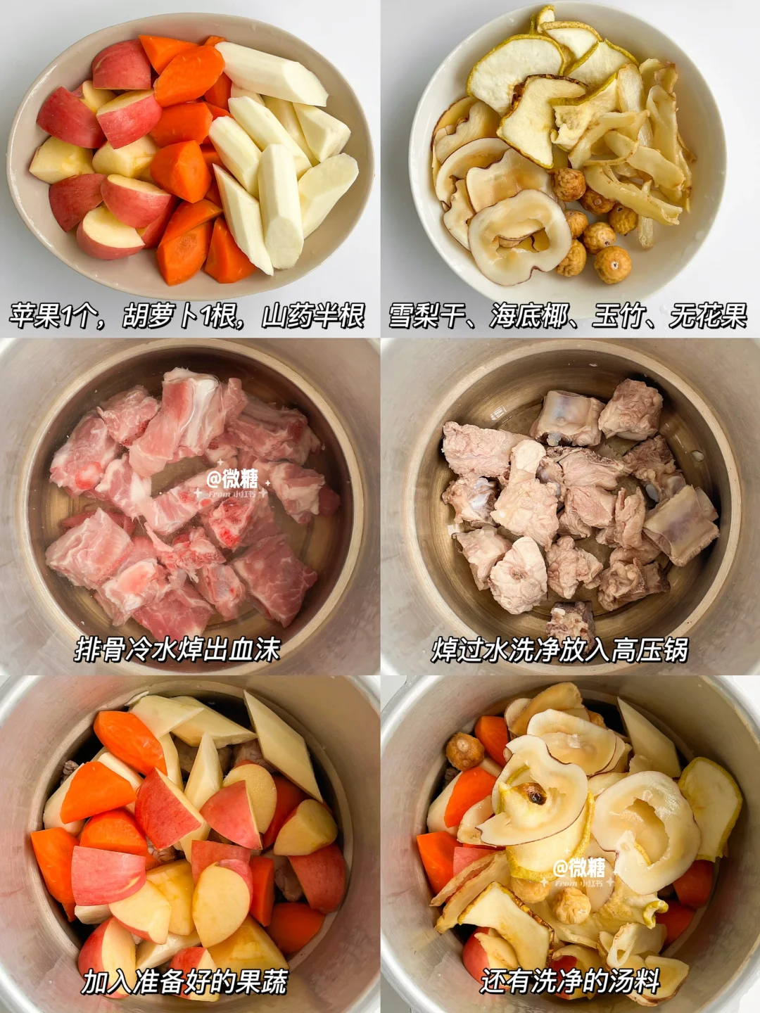 这不天气一下子降温了嘛~家里小朋友早上起来都会干咳两声😱我的脸也是超级干!!感觉安排煲汤😄连着喝了两天的苹果山药排骨汤,孩子真的就不咳了🥹感觉主要还是太干燥。 🧑🏻🍳准备食材: 1个苹果,1根胡萝卜,半根铁棍山药,排骨,无花果,海底椰,玉竹,雪梨干 🥣这碗汤真的超好喝的!!清清甜甜~全家都爱喝,小朋友也很喜欢,喝了三碗😆秋冬天气干燥,很适合煲这款汤喝✅大家快来一起养生~