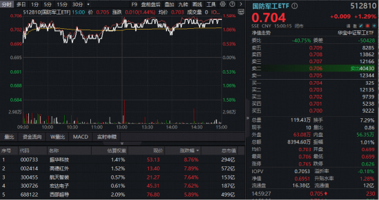 国防军工ETF(512810)汇聚国防军工板块核心资产,早盘高开后全天高位震荡,场内收涨1.29%,成交8394.6万元,较上个交易日略有缩量。