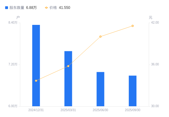 日期A股户数(户)流通A股户均持股数(股)户均持股市值(万元)2025-09-306879325466.78105.812025-06-306984425083.63100.362025-03-317584723098.3682.622024-12-318338421010.5270.742024-09-309187919056.6364.912024-06-309830217811.4847.252024-03-319383418659.5954.372023-12-317715122694.5189.872023-09-308115521560.3187.062023-06-307437823524.7997.65