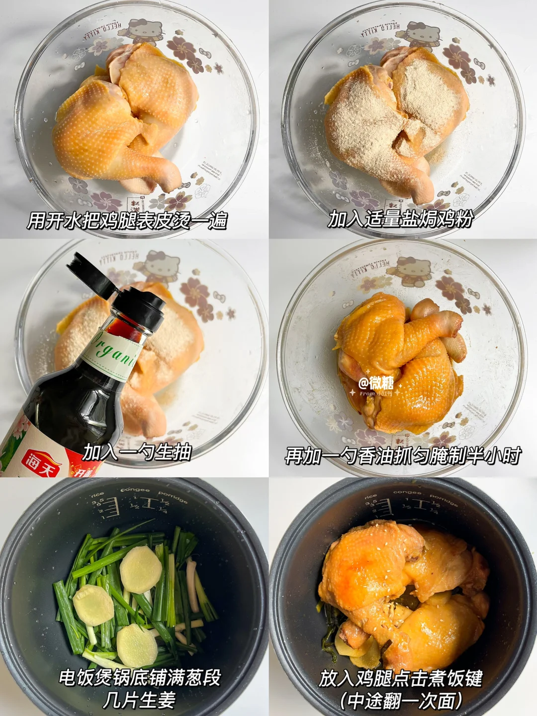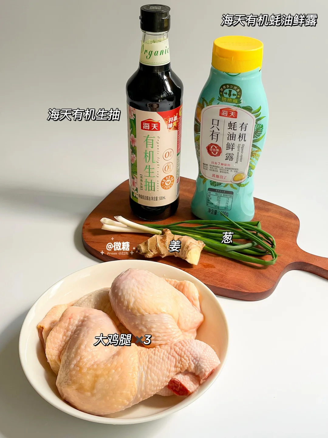 新鲜大鸡腿✖️3,姜,葱,盐焗鸡粉少许,海天有机生抽,海天有机蚝油鲜露