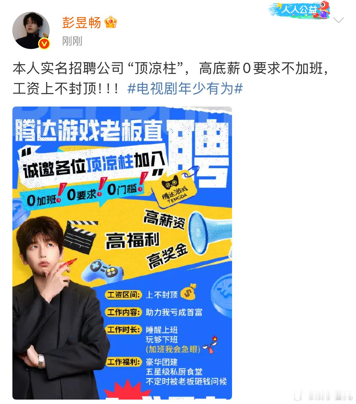 彭昱畅新剧招聘工资上不封顶 88888奖金无KPI?太绝了!