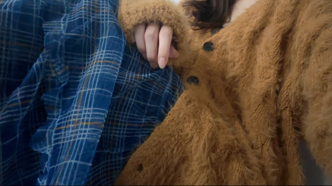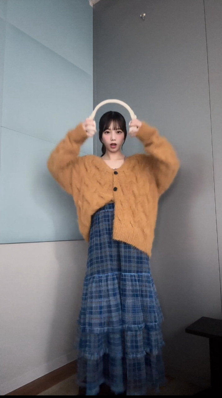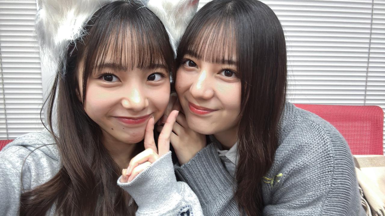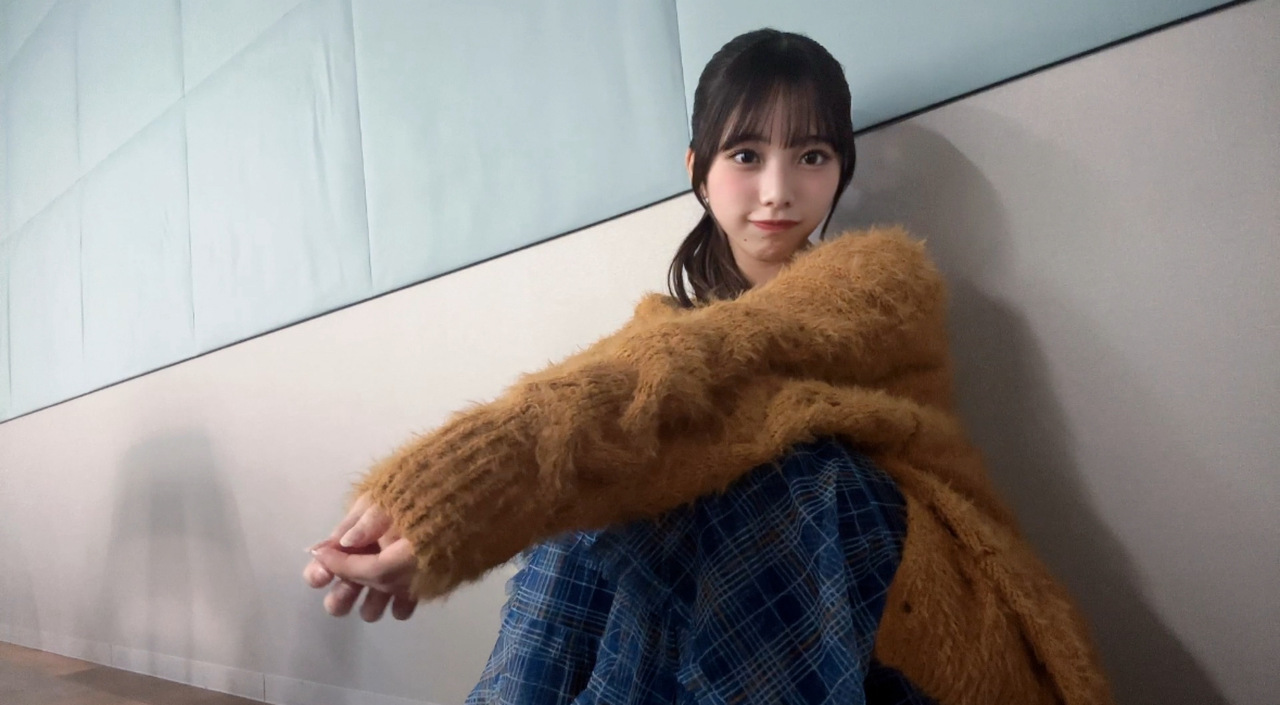 下田衣珠季「オオカミきち 小坂さんのお部屋にお邪魔させていただいてました♡お写真もありがとうございます😊昨日は秋をイメージに。青のスカートにこのセーターと同じ色のラインが入ってるから合わせてみたんだー」