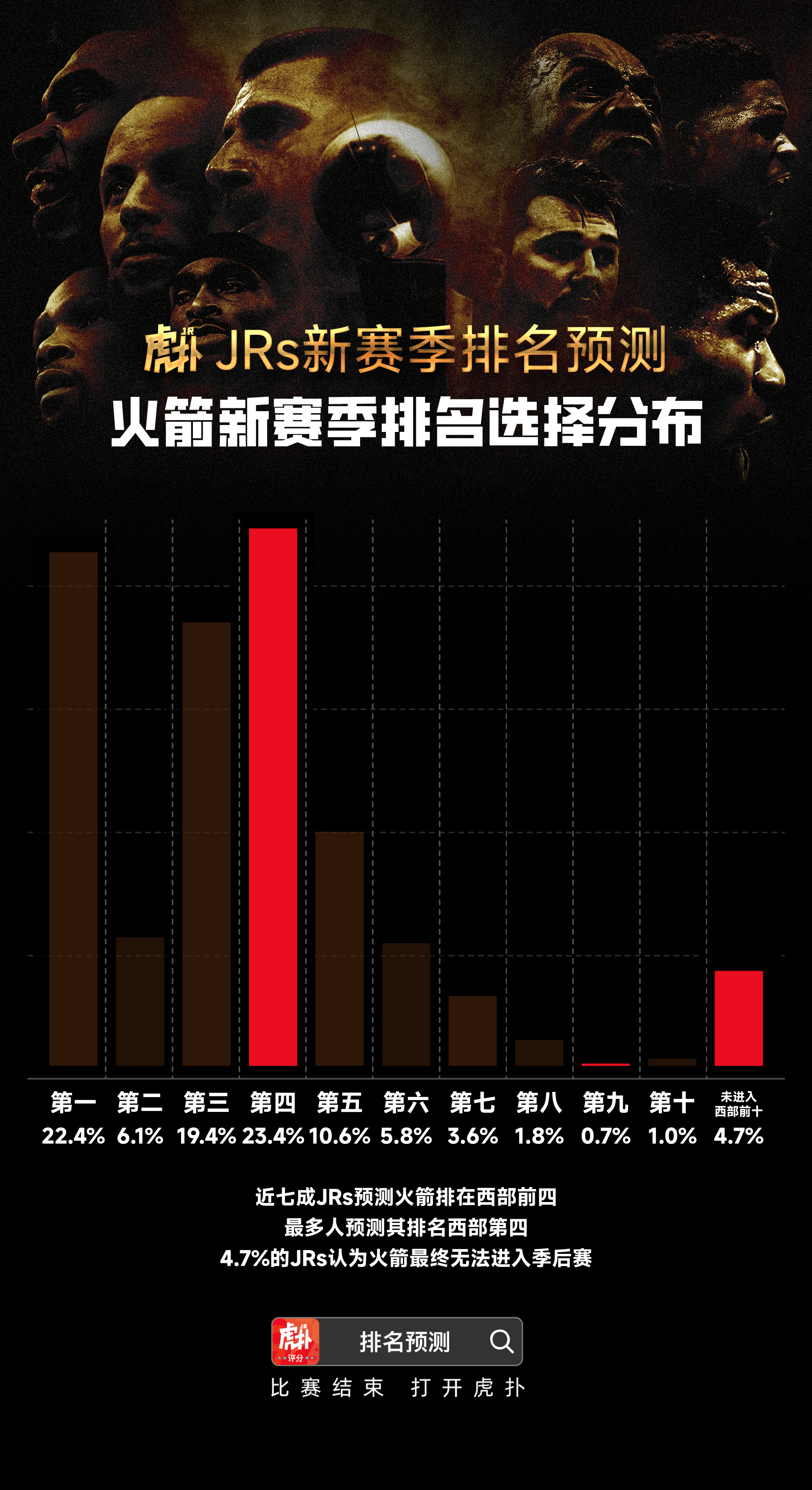 其中,近70%的JRs预测火箭将在本赛季排在西部前四,最多人预测其排名西部第四(23.4%),其次有22.4%的JRs预测火箭排名西部第一,还有19.4%预测火箭排名西部第三。