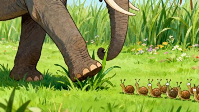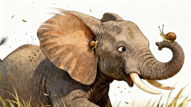 小东西你敢骂我,信不信我用耳朵把你扇到地上去,一脚把你踩成肉饼。小螺蛳躲到了大象耳根的后面。我不信,我不信。你来踩我呀,踩我呀。大象的耳朵猛烈扇动,却根本奈何不了小螺蛳。大象的耳后成了最好的避风港。长长的象鼻触不到它,四条象腿奈何不了它。小螺蛳还可以在耳后搔它的痒,令大象痒得跳脚却又无可奈何。