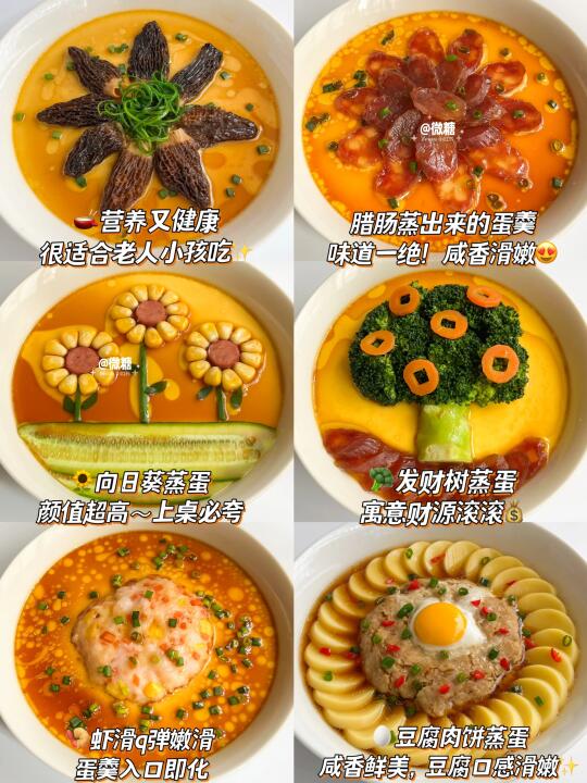 🐍过年倒计时啦‼️还有几天就过年咯~今年年夜饭想好做什么了吗,给姐妹们分享点新年菜谱灵感🎊分享6款花样蒸蛋✨不仅颜值高寓意好,味道更是没得说!而且蒸菜还不上火,非常适合家里有老人小孩的✅ 🧧羊肚菌蒸蛋~喜气洋洋 🧧腊肠蒸蛋~花开富贵 🧧向日葵蒸蛋~一路向阳 🧧发财树蒸蛋~财源滚滚 🧧虾滑蒸蛋~蒸蒸日上 🧧豆腐肉饼蒸蛋~招财进宝 🎊一年一次的年夜饭,新年气氛必须拉满~这6款菜谱精致又好做!建议大家都收藏起来~过年给家人露一手🥳🥳