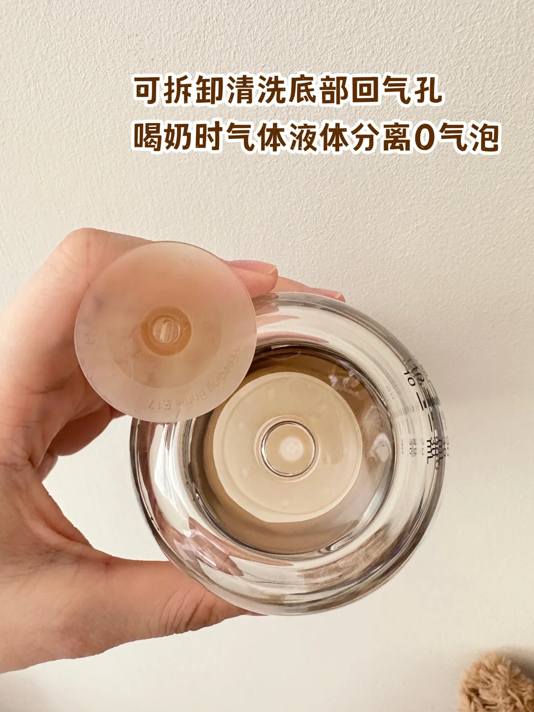世喜这个奶瓶底部有个回气阀,空气直接从下面排出💨,不混进奶液里,喝的时候几乎没有气泡。现在喂完拍两下嗝就能放下,宝宝肚子舒服多啦