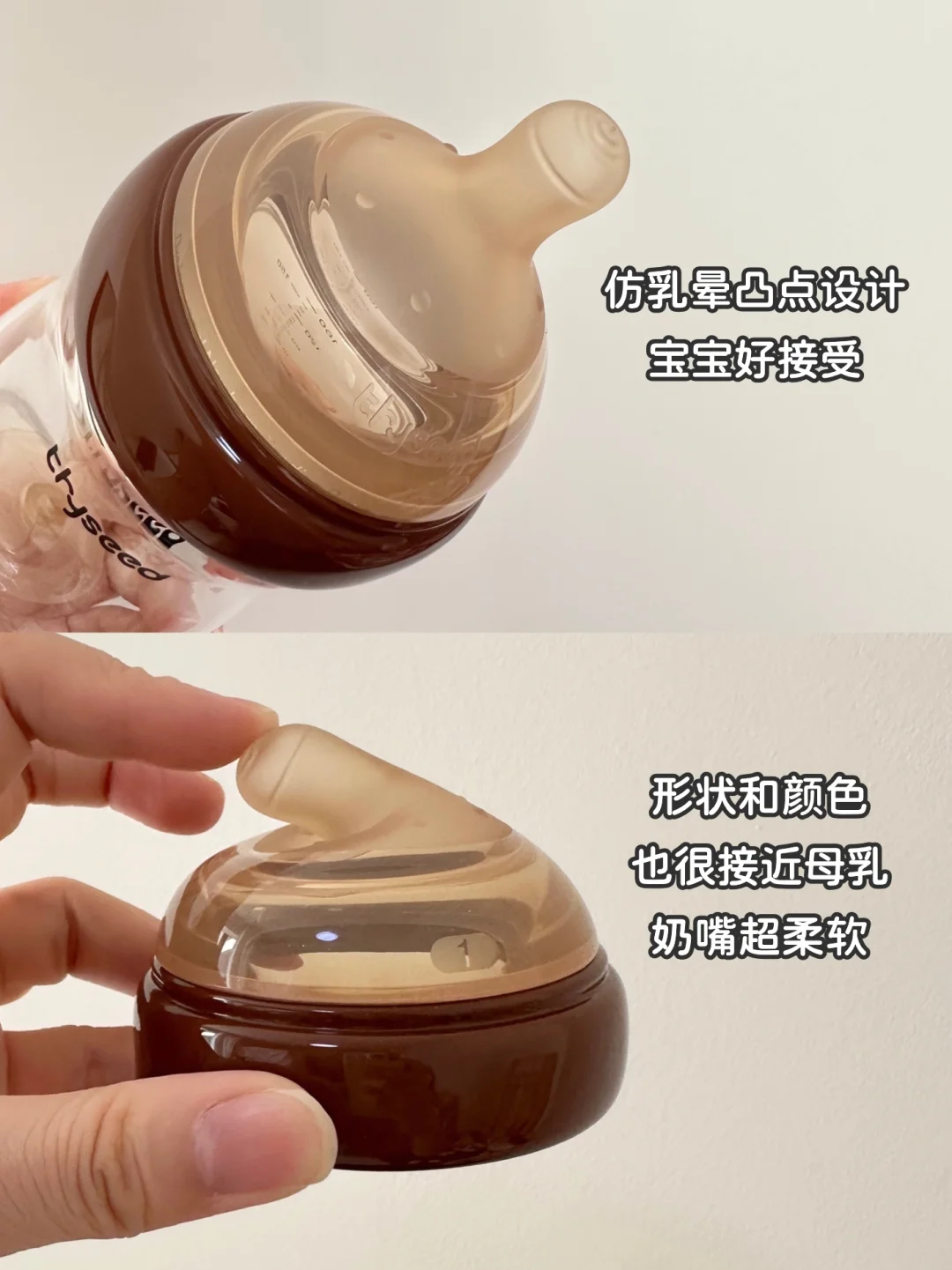 液态硅胶奶嘴QQ软软的,形状和颜色也接近母乳,宝宝第一次用就喝得很顺✌🏻