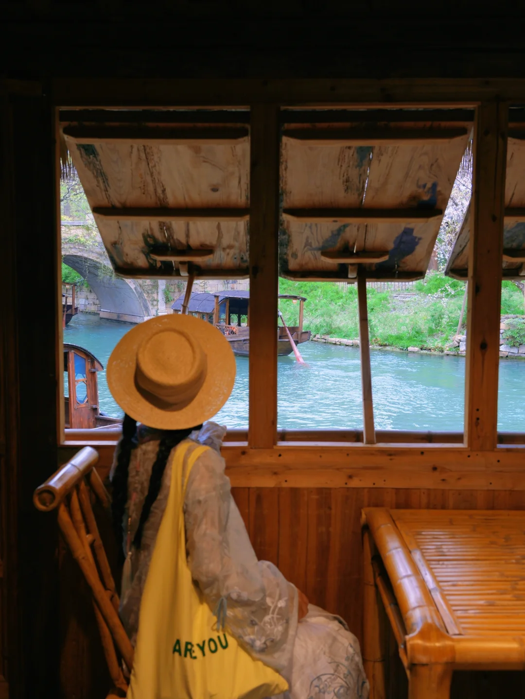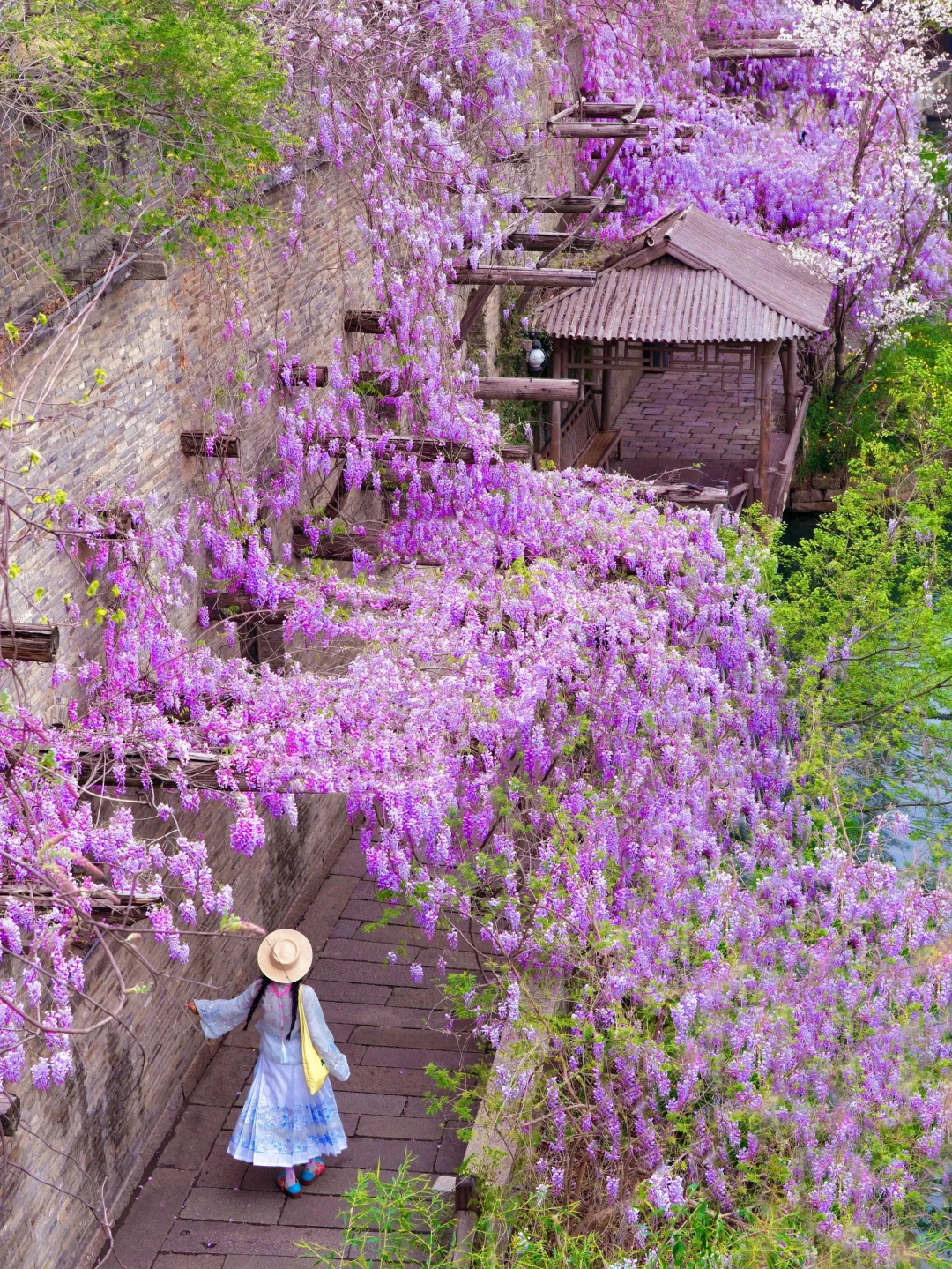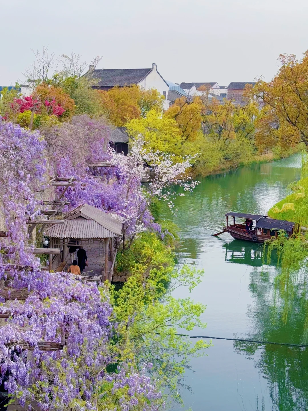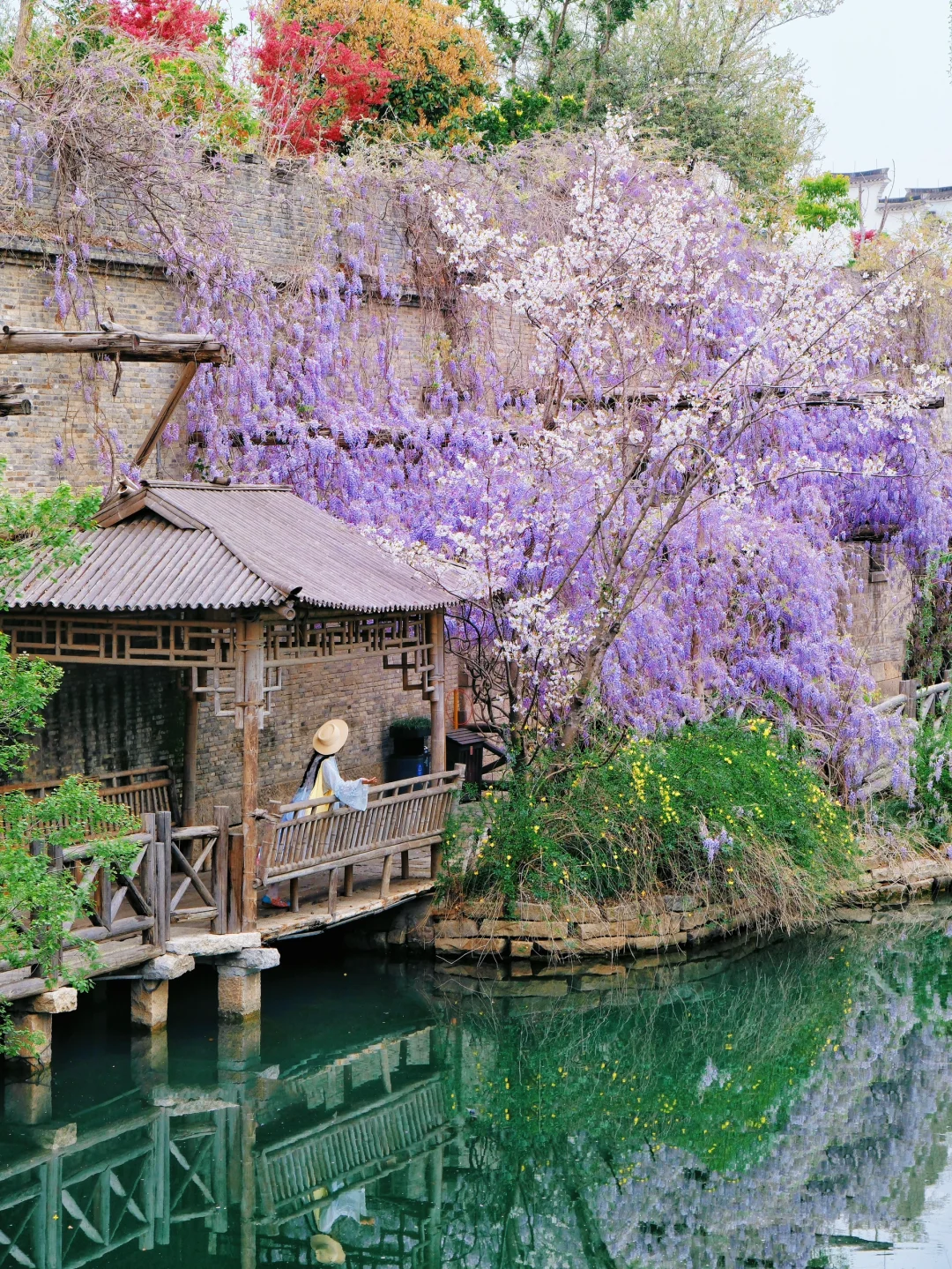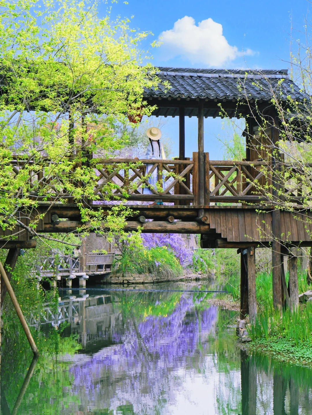 四月 限 定 💜紫色浪漫!长廊架垂落着紫藤花瀑,站在廊桥俯拍水中倒影,虚实交错的画面像是打翻的春日调色盘🎨