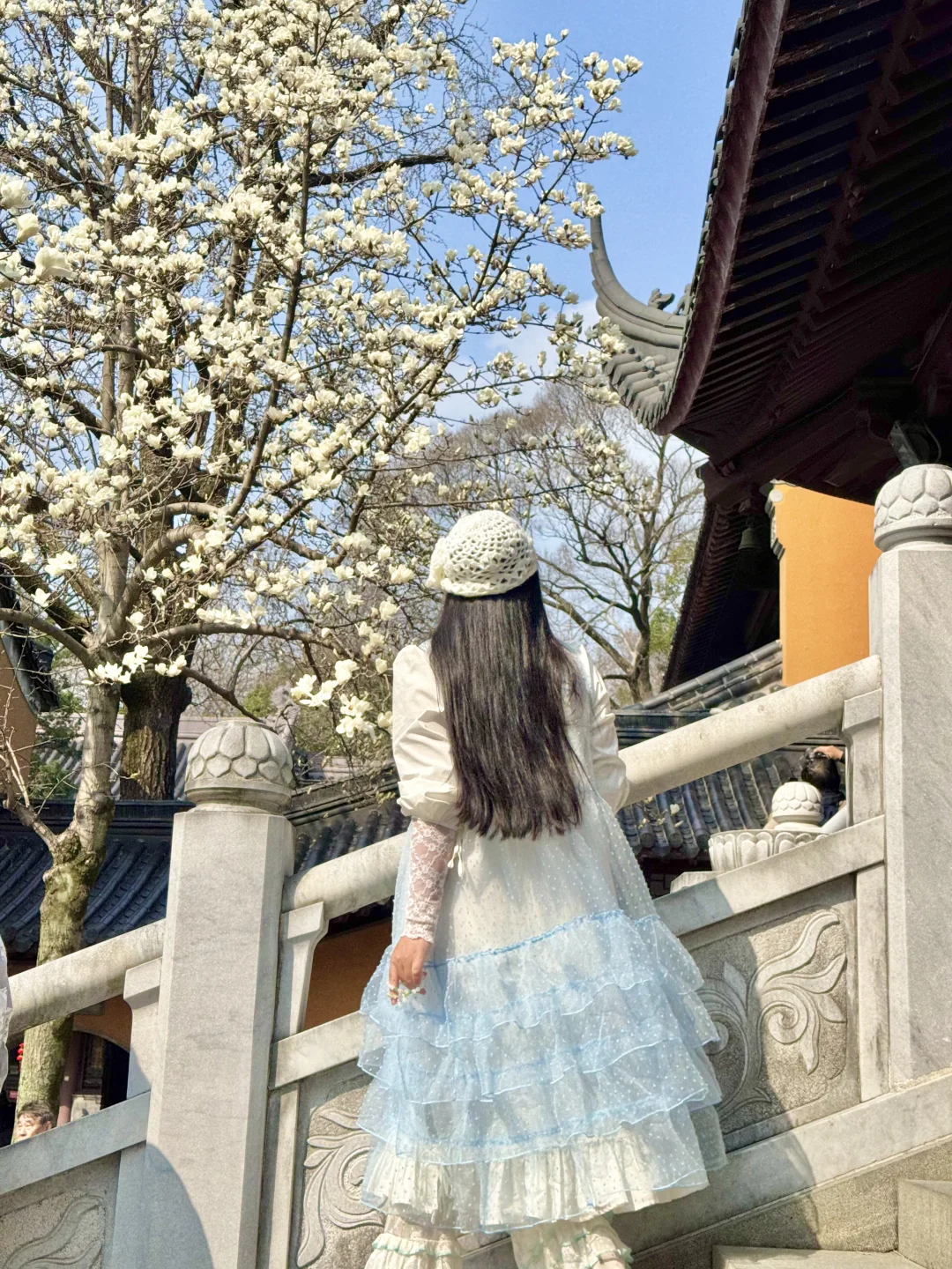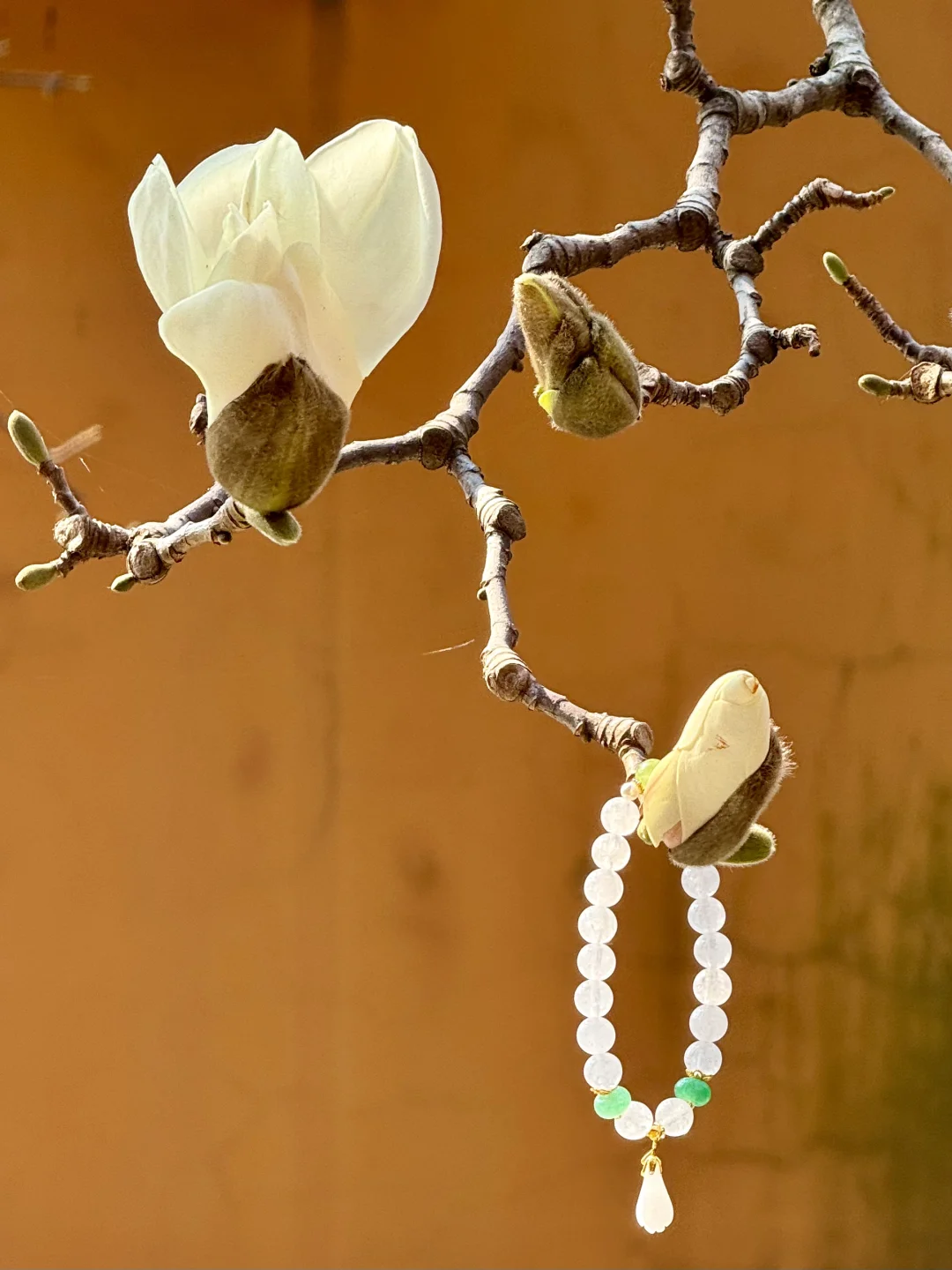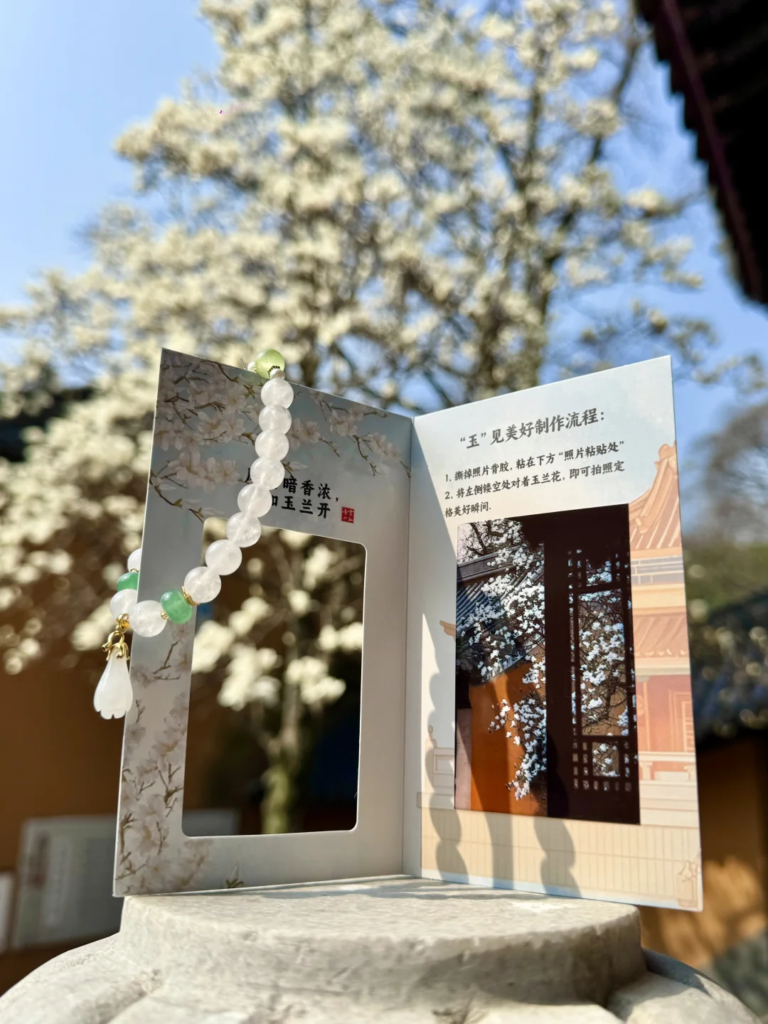 ▪️在 店 里看见好多人 排 队🙏 贝才 神,一问才知道原来这里求💰zui 灵!在cai 神 dian可🆓打 印一张照片!还是玉兰花框景!拍照真的好有氛围!好喜欢玉兰花 系 列 的 🫴串,白色+翠青色 点 缀,末端还有形似兰花吊坠,整体都好春日清新啊💚🤍