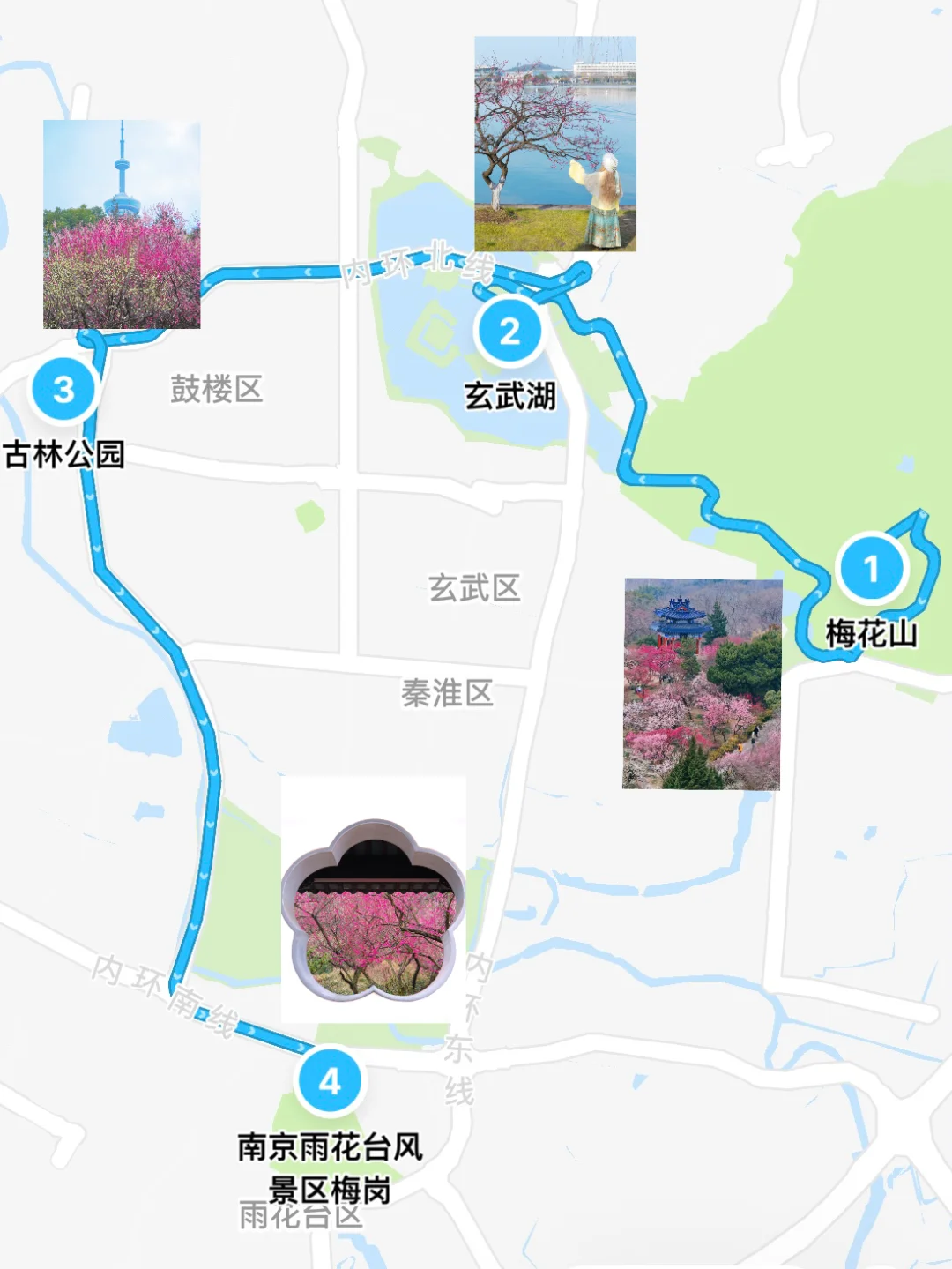 5号门进-石象路-博爱阁-红楼艺文苑-梅花艺术中心-梅花谷-长生鹿苑-燕雀湖