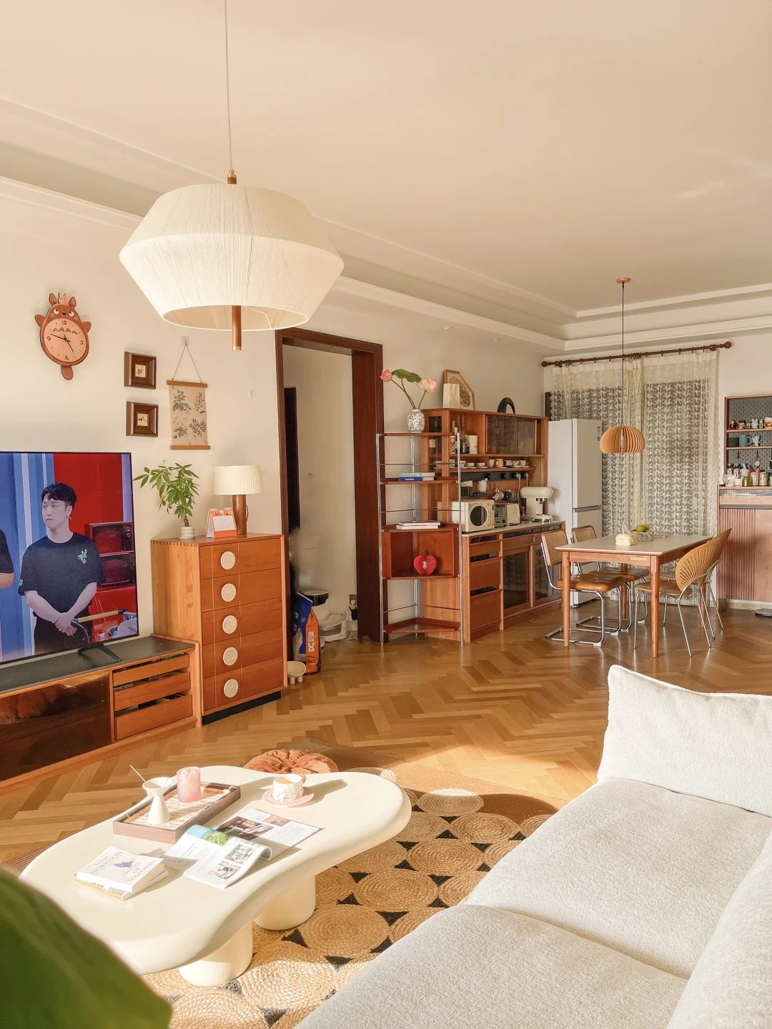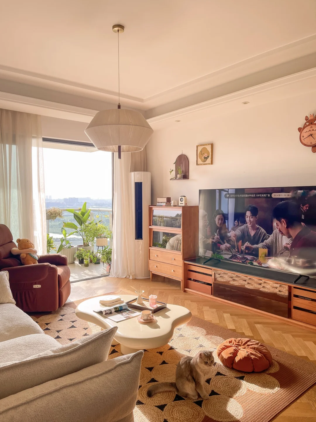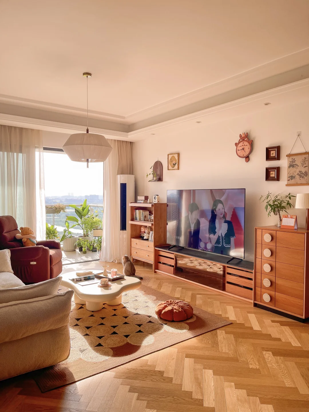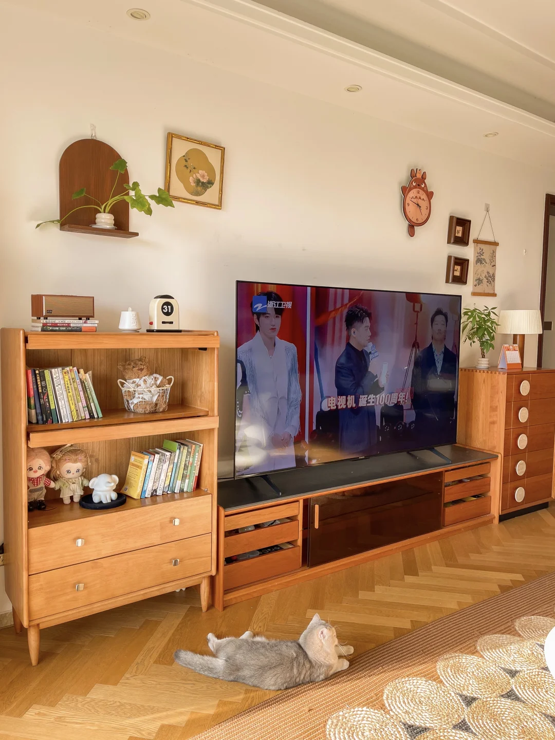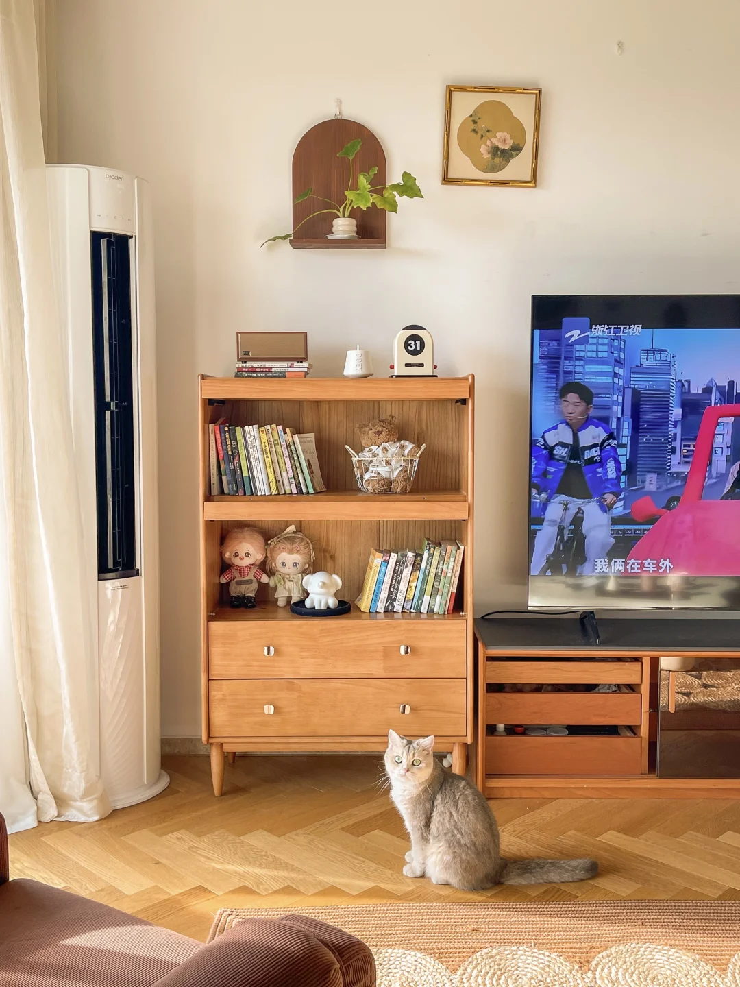 🍃家具选择:原木色的客厅边柜,两层分区满足多元收纳需求,底部还有双抽储物太棒啦~和我家超搭的!