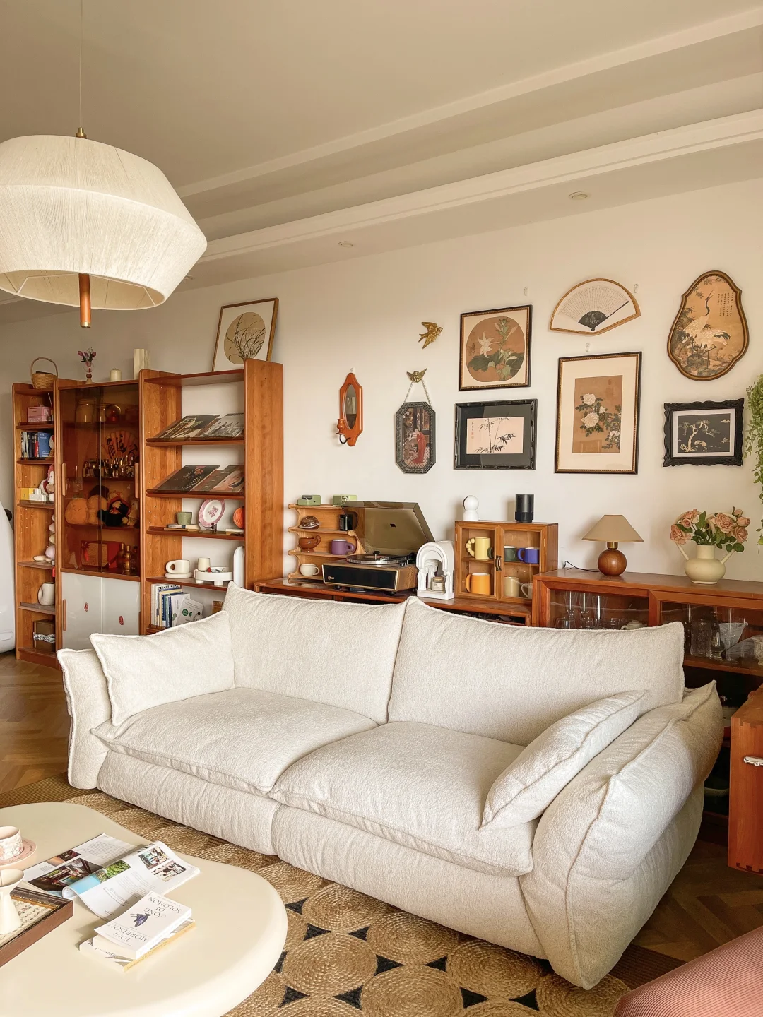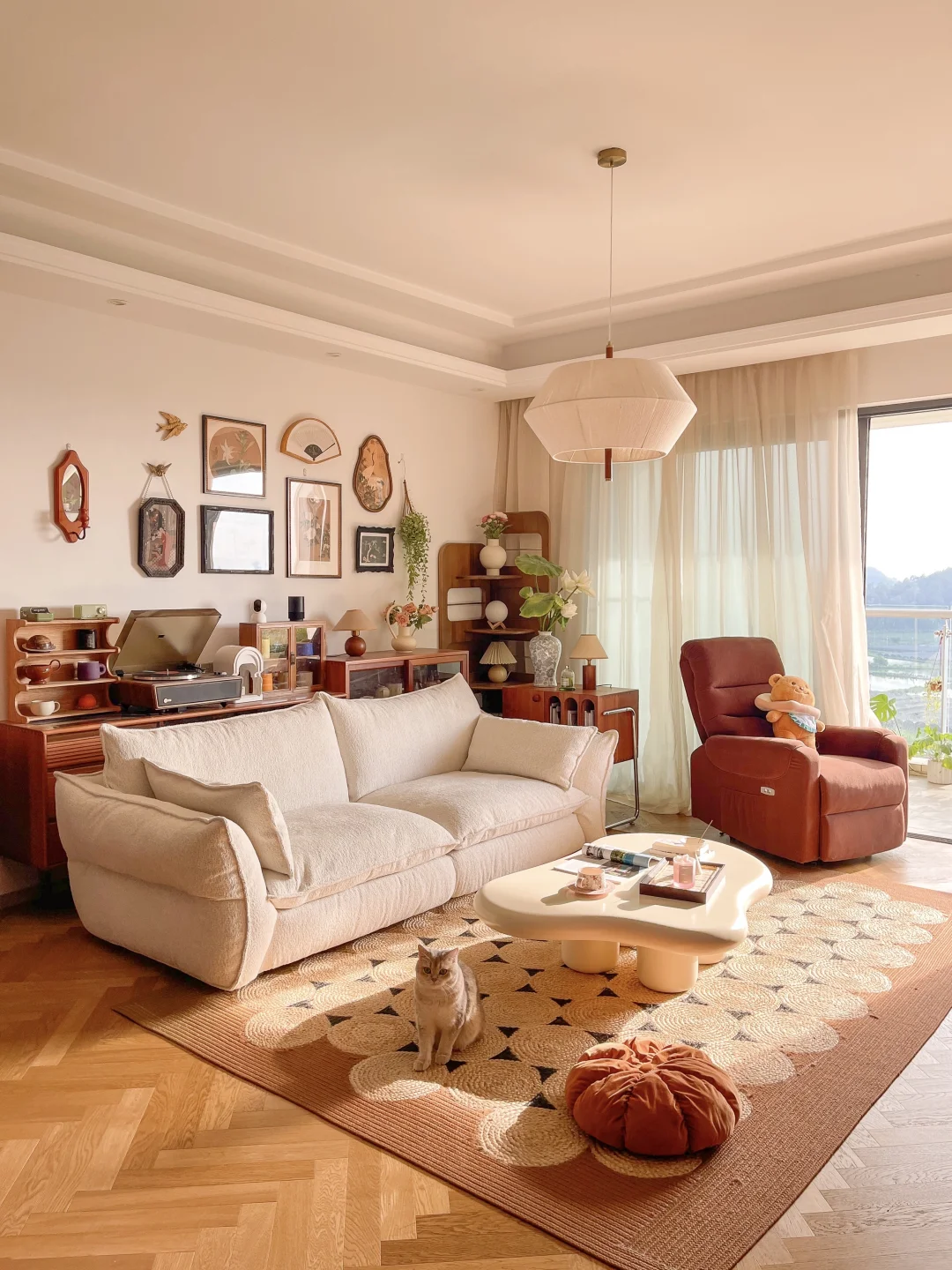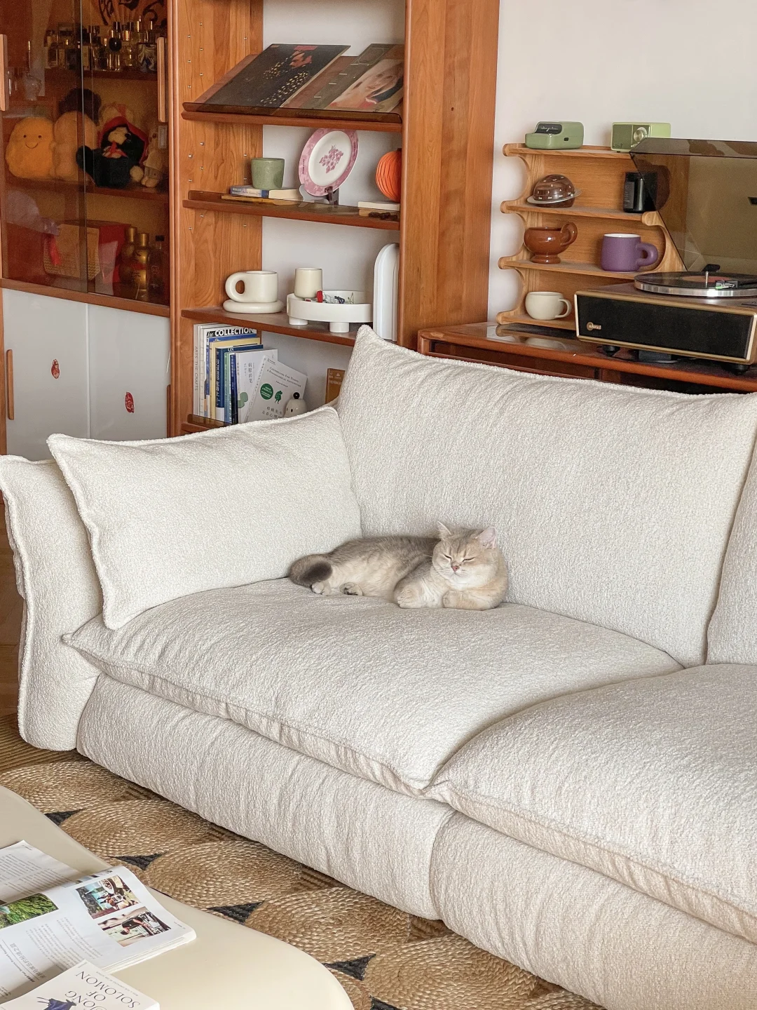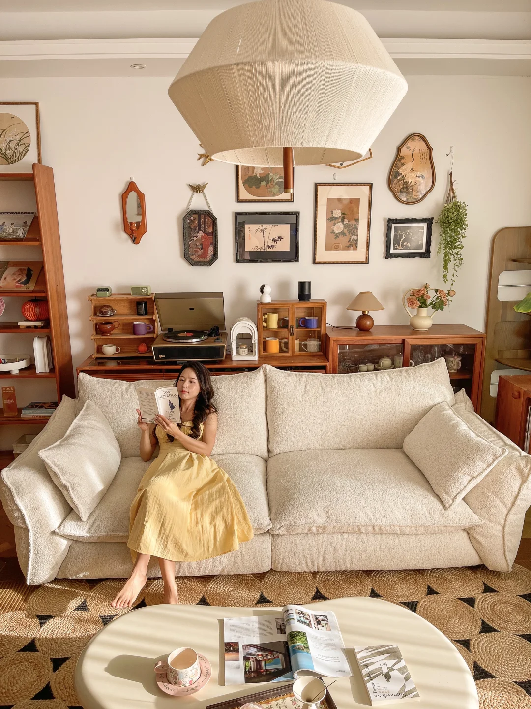 🍃软装选择:沙发选择格拉朵的,低矮松弛的款式,坐感舒服、两边的扶手和靠背造型独特,像被软fufu的云朵包裹着,软乎乎但又带着恰到好处的支撑感,像陷进云朵里却不会塌得没形