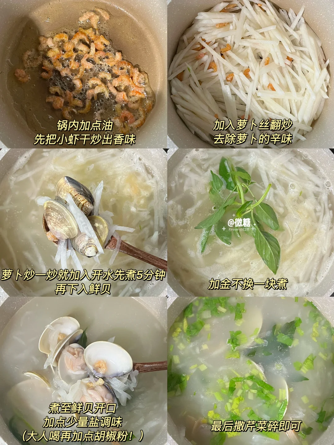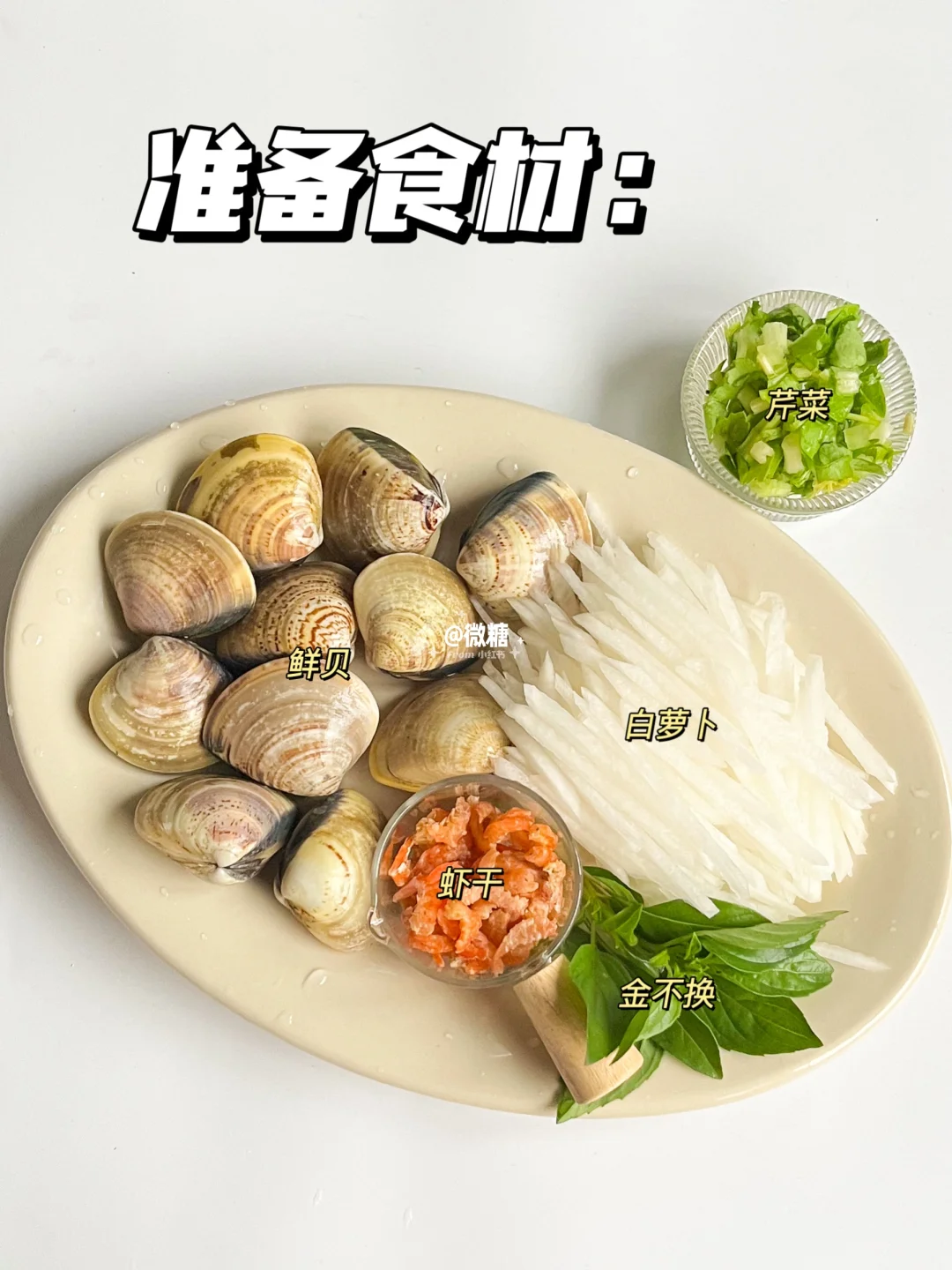 今天用10分钟完成这道超鲜美超清甜的萝卜鲜贝汤✅无需复杂的调料。非常简单的做法!冬季必喝~暖胃暖心,喝完整个人都超级舒服😌平时大鱼大肉吃腻了就试试这碗汤吧!鲜贝和萝卜的组合真是太绝啦🥰 ⭕️准备食材: 鲜贝,白萝卜,虾干,芹菜,金不换(有干贝可以加点)