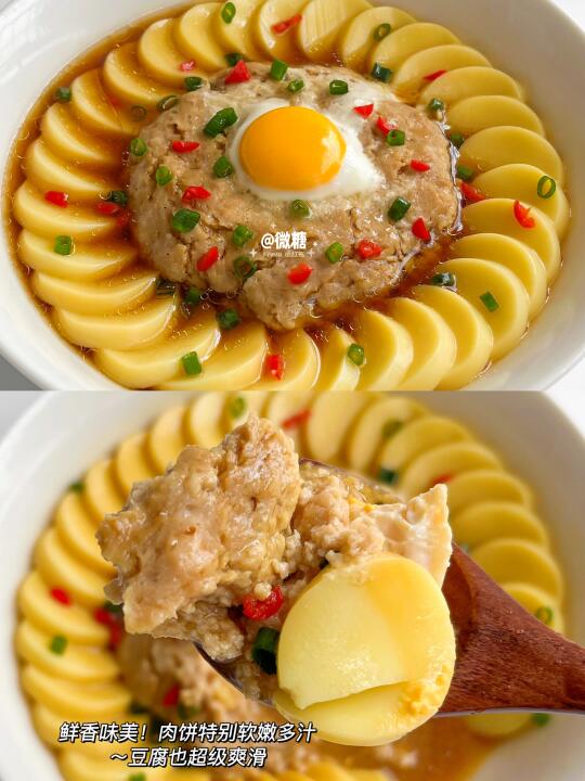 全家一致同意这道豆腐肉饼蒸蛋加入年夜饭菜单!!🧨不仅好看又好吃!很适合家里老人小孩吃~清淡鲜美😋寓意蒸蒸日上🔥图个好意头🎊 这道菜做法也很简单!颜值也特别高,一上桌全家都夸😝大家一起学起来 ⭕️准备食材: 玉子豆腐2条,猪肉,鸡蛋,香葱 ⭕️做法大家看图片哈~有详细教程都编辑在图片上啦 有什么不懂的在评论区留言哦