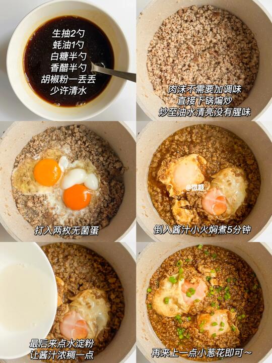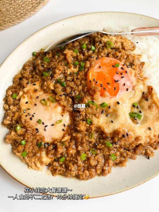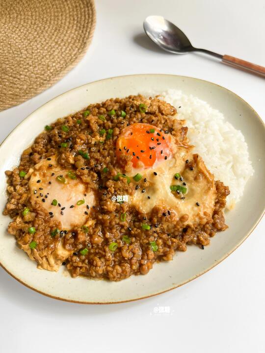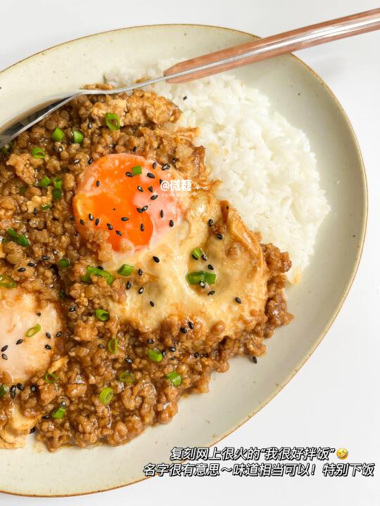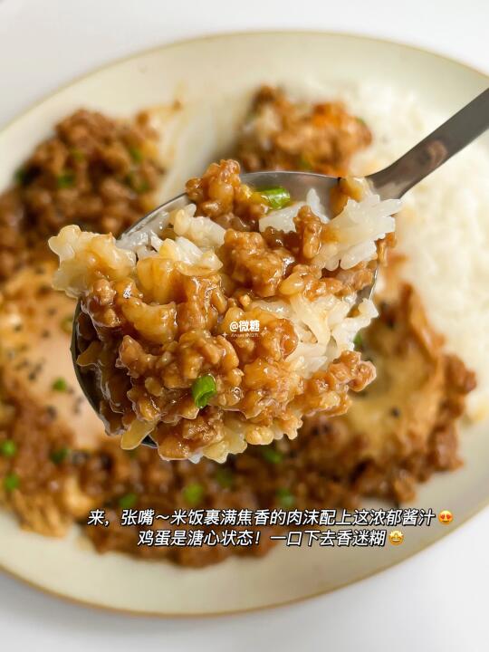 热腾腾的米饭盖上超浓郁的肉末酱汁~配上这溏心鸡蛋!一口一个不吱声🤫