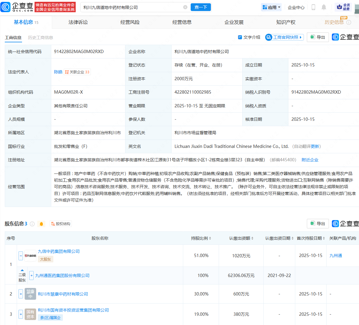 企查查APP显示,近日,利川九信道地中药材有限公司成立,法定代表人为陈皓,注册资本为2000万元,经营范围包含:地产中草药(不含中药饮片)购销;中草药种植;初级农产品收购;农副产品销售等。企查查股权穿透显示,该公司由九州通(600998)全资子公司九信中药集团有限公司、利川市慧康中药材有限公司等共同持股。