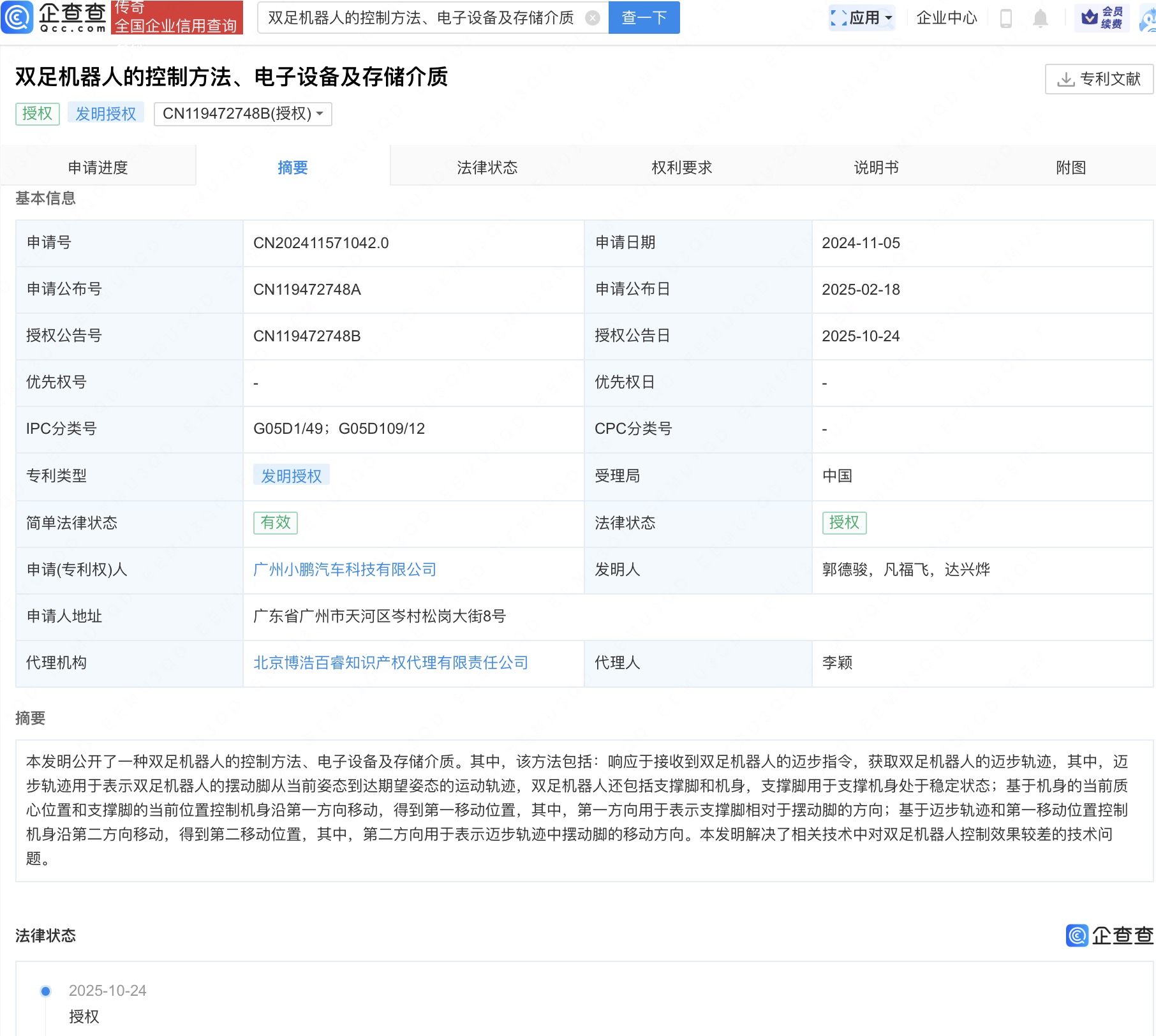 企查查APP显示,近日,广州小鹏汽车科技有限公司申请的“双足机器人的控制方法、电子设备及存储介质”专利获授权。企查查专利摘要显示,该方法包括:响应于接收到双足机器人的迈步指令,获取双足机器人的迈步轨迹,其中,迈步轨迹用于表示双足机器人的摆动脚从当前姿态到达期望姿态的运动轨迹,双足机器人还包括支撑脚和机身,支撑脚用于支撑机身处于稳定状态;基于机身的当前质心位置和支撑脚的当前位置控制机身沿第一方向移动,得到第一移动位置,其中,第一方向用于表示支撑脚相对于摆动脚的方向;基于迈步轨迹和第一移动位置控制机身沿第二方向移动,得到第二移动位置,其中,第二方向用于表示迈步轨迹中摆动脚的移动方向。本发明解决了相关技术中对双足机器人控制效果较差的技术问题。