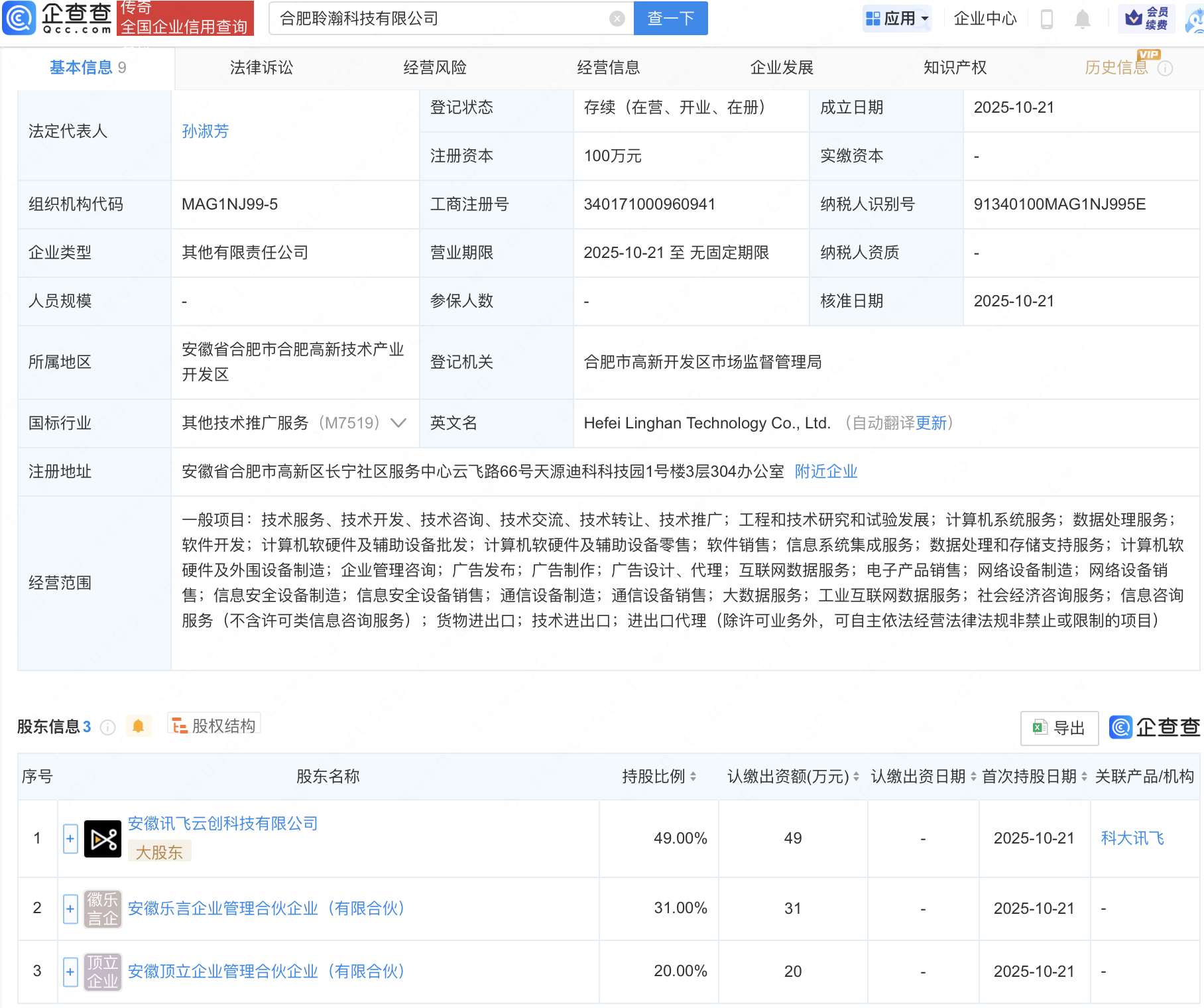 企查查APP显示,近日,合肥聆翔科技有限公司、合肥聆瀚科技有限公司成立,经营范围均包含:大数据服务;工业互联网数据服务;社会经济咨询服务等。企查查股权穿透显示,二者皆由科大讯飞(002230)全资子公司安徽讯飞云创科技有限公司等共同持股。