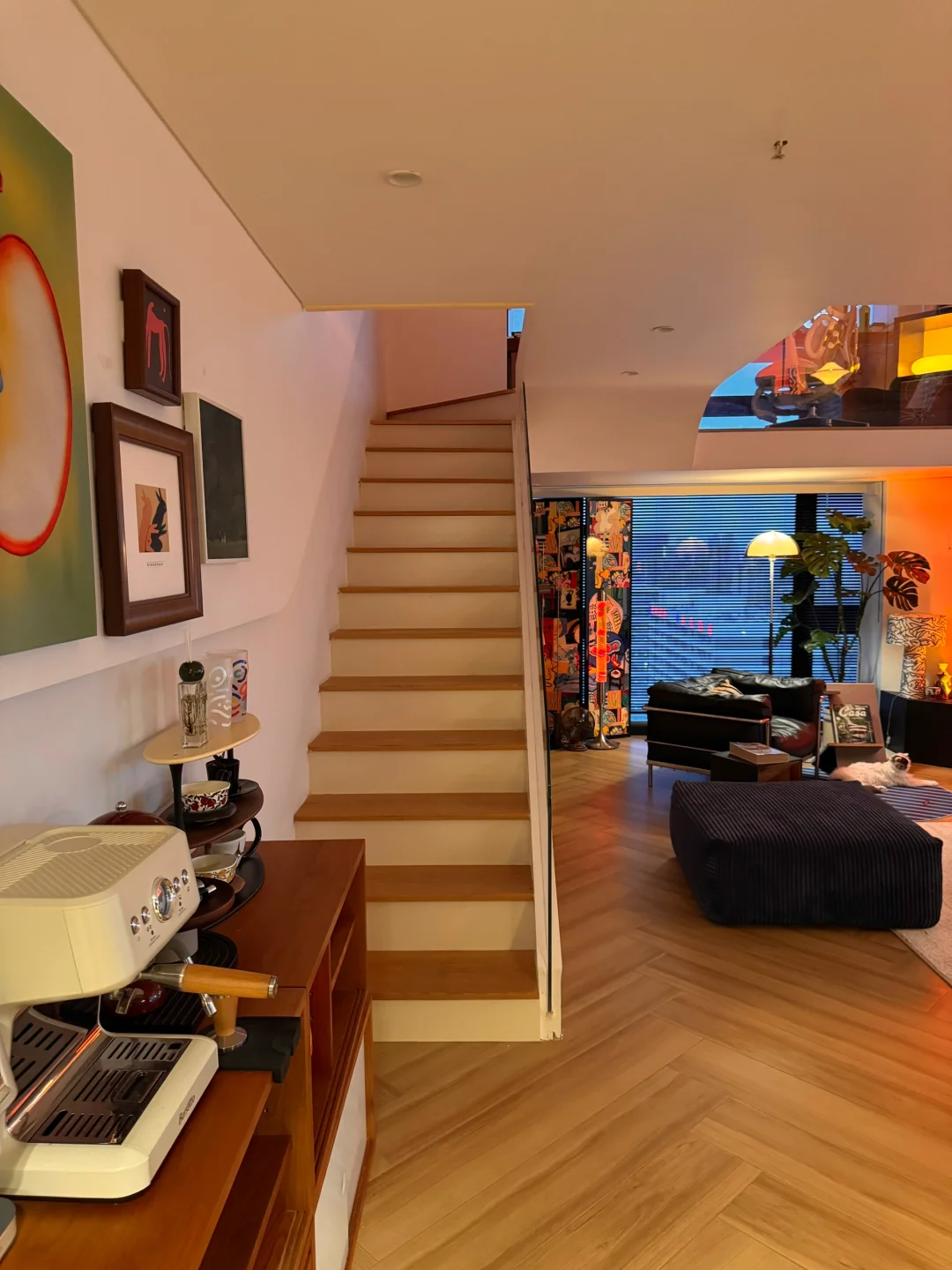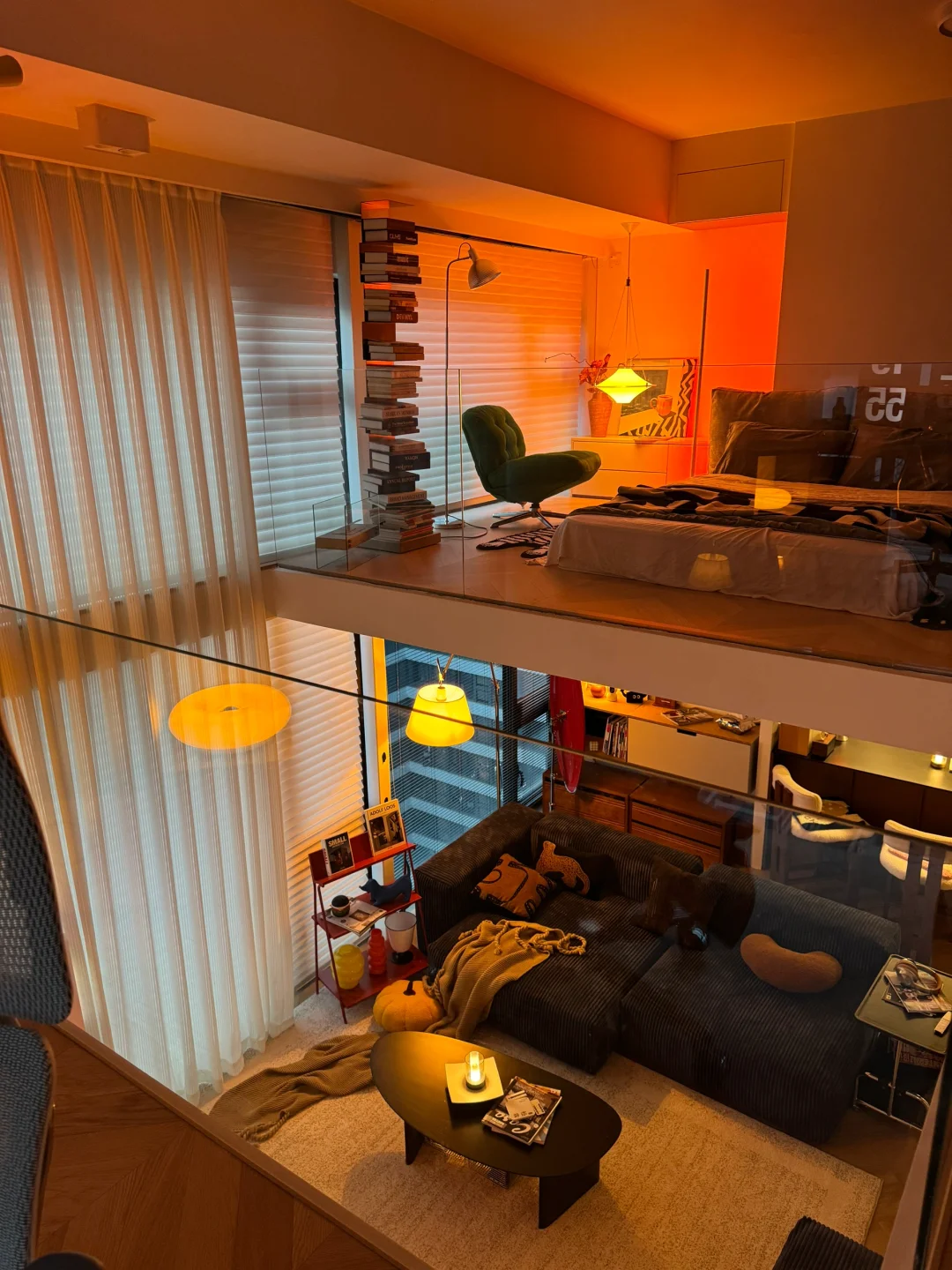 楼下客厅+厨房,楼上工作区+睡觉的地方,中间挑空2.2×3.3米,双面采光,白天根本不用开灯。