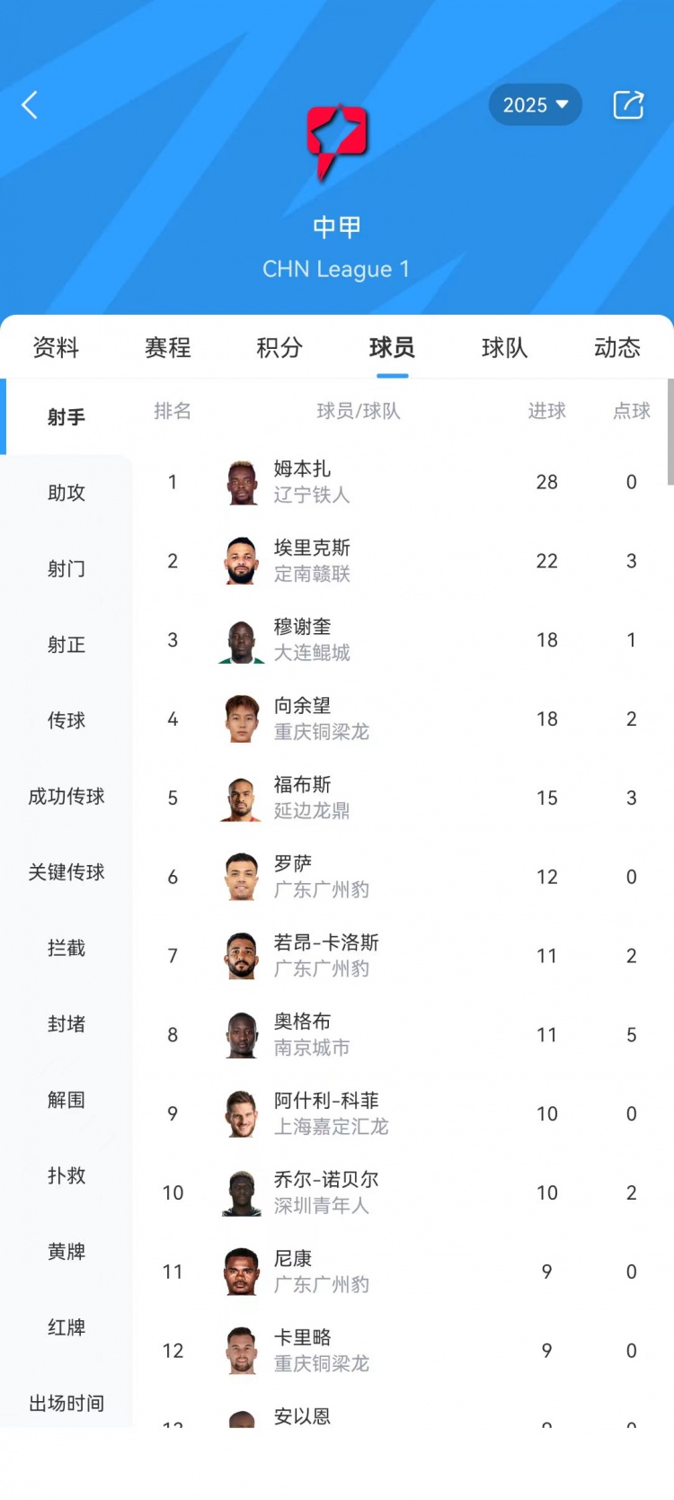 直播吧10月27日讯中甲第28轮战罢,射手榜方面,姆本扎以28球领跑,本轮打进两球的埃里克斯排在第二,穆谢奎、向余望和福布斯分列三至五位。
