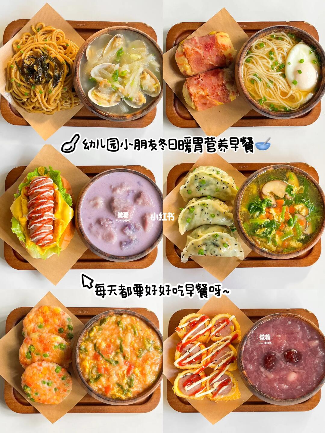 早餐不知道给孩子做什么的快收藏好啦‼️再也不用怕孩子赖床了🤣每天起床的动力就是吃早餐🥣营养美味又颜值在线~小朋友不爱都很难🥳孩子长个期间,早餐一定要吃好!快来看看食谱吧 1️⃣葱油拌面➕白萝卜鲜贝汤 2️⃣阳春面➕培根土豆卷 3️⃣芝士热狗包➕香芋紫薯奶 4️⃣鲜虾时蔬饼➕番茄疙瘩汤 5️⃣香肠吐司卷➕紫薯银耳羹 6️⃣鲜虾韭菜鸡蛋饺➕鲜蔬芙蓉汤