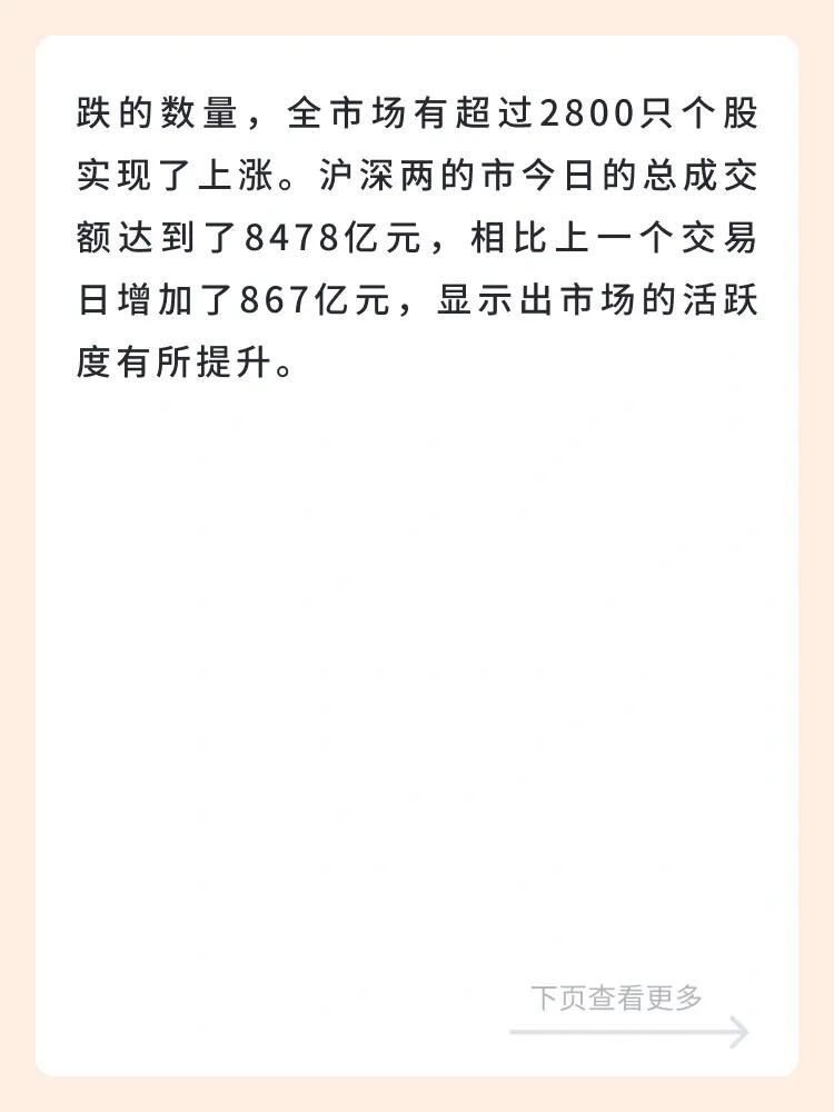 👉 纵观整个股市,上涨的股票数量超过下跌的数量,全市场有超过2800只个股实现了上涨。沪深两的市今日的总成交额达到了8478亿元,相比上一个交易日增加了867亿元,显示出市场的活跃度有所提升。