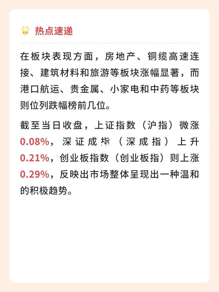 👉 截至当日收盘,上证指数(沪指)微涨0.08%,深证成指(深成指)上升0.21%,创业板指数(创业板指)则上涨0.29%,反映出市场整体呈现出一种温和的积极趋势。